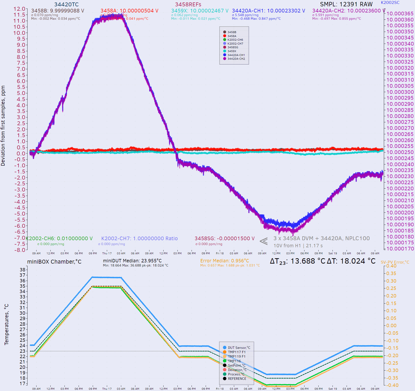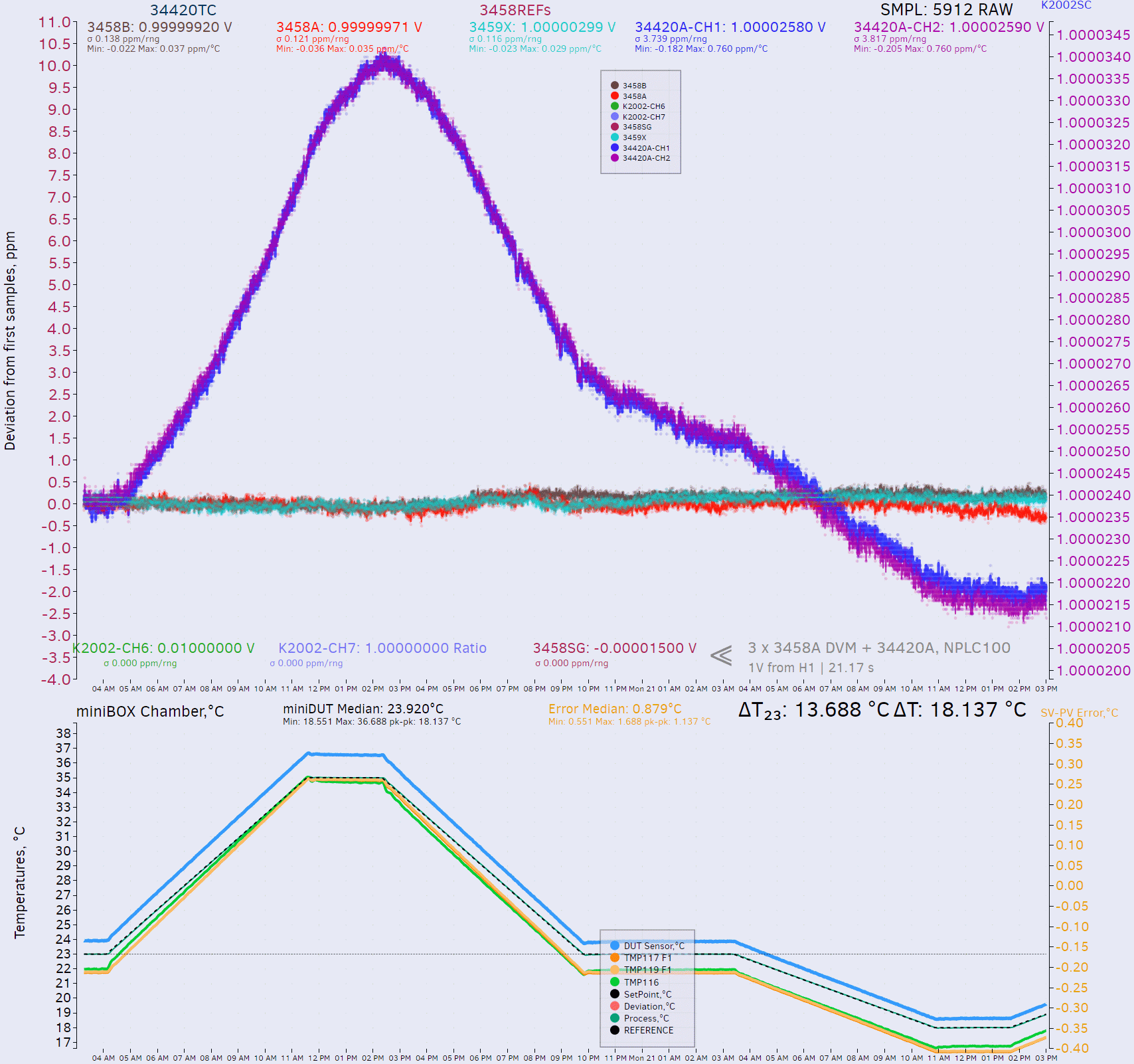 For testing HP34420A stability across different ambient temperatures instrument was placed in the TEC air-bath with programmable temperature sweep from +18°C to +35 °C. Both reference 3458As (outside of the chamber) and DUT (inside) were connected to same constant DC voltage source, Fluke 5720A calibrator. TC test took 78 hours to complete and both CH1 and CH2 were monitored. All meters were configured to use NPLC 100.