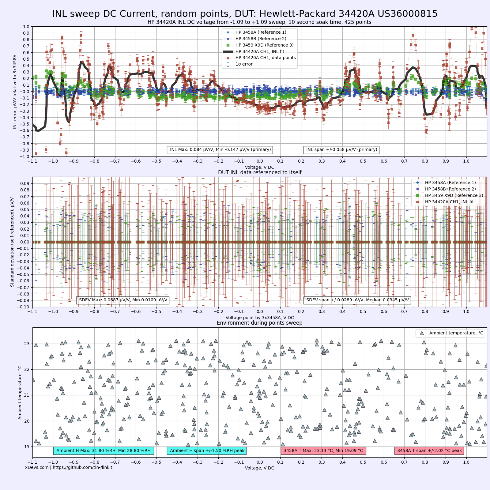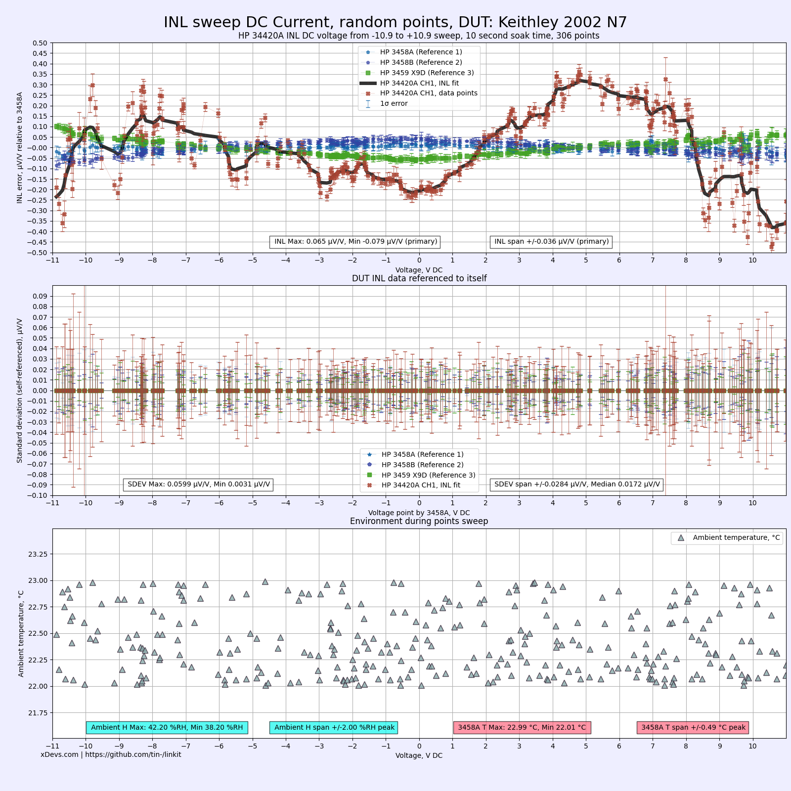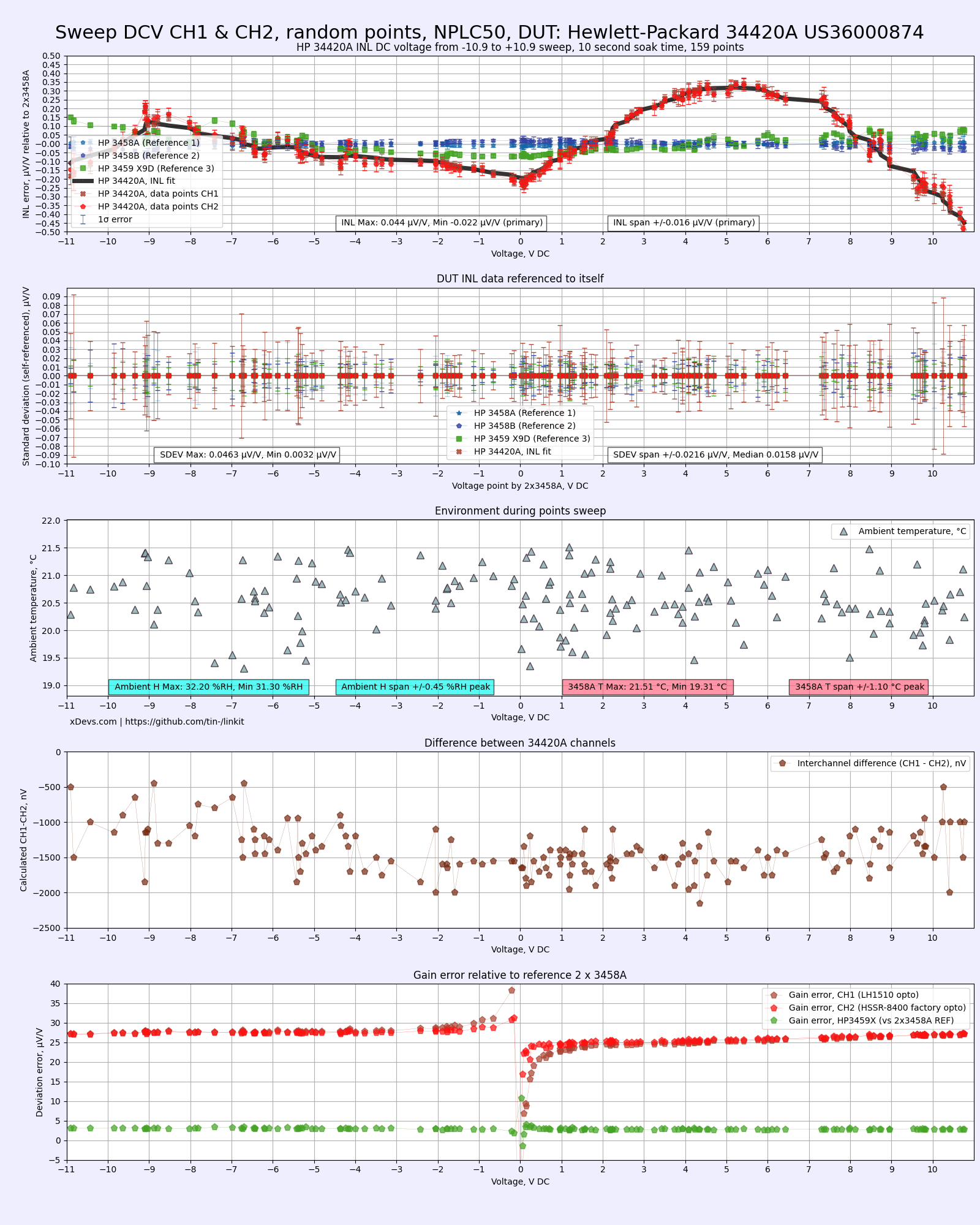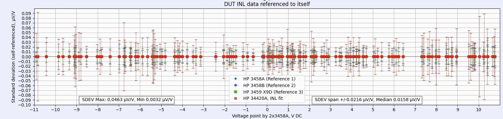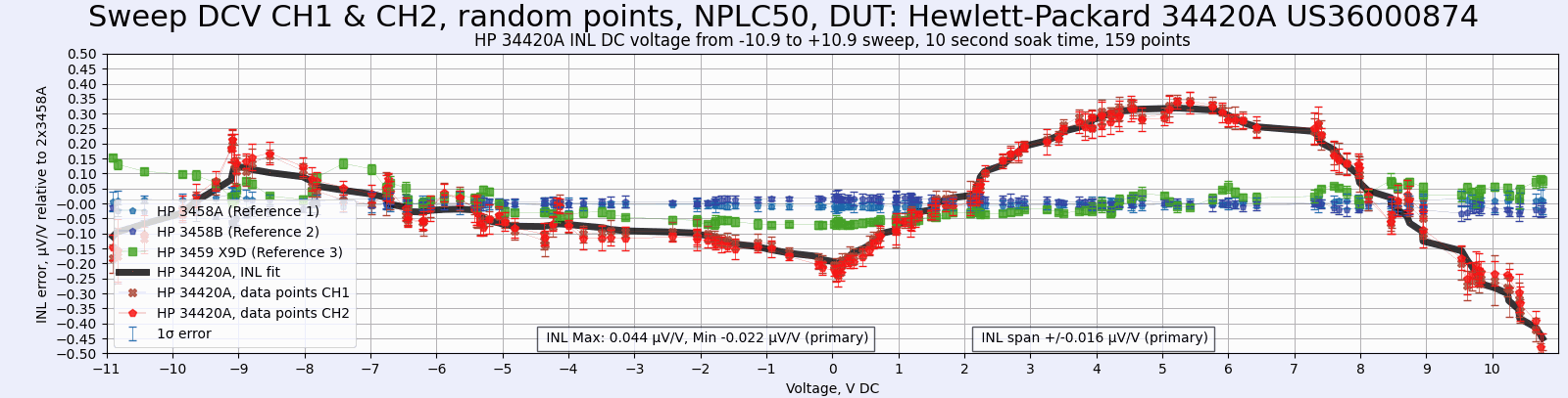 - Top chart represents INL error against the HP3458A meters, in voltage points from -11 to +11 V in random points.