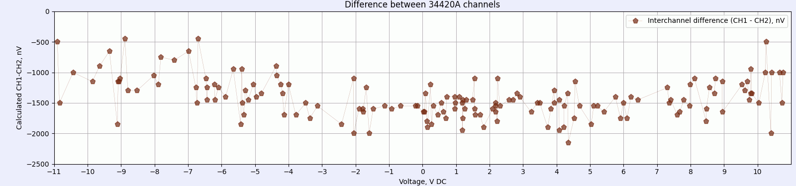 Running the data analysis script but with both CH1 and CH2 connected to same 5720A output we can again capture 10 V INL chart. There is no visible difference between either of the channels on this INL sweep. Which is a good news if you are using 34420A with channels substituion method.