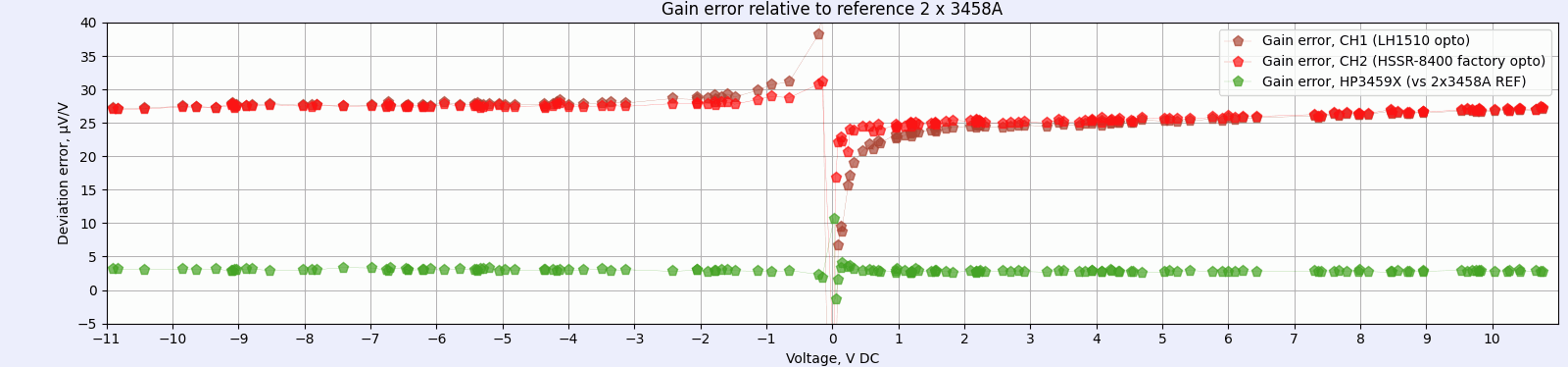 First of all, there is clearly visible gain error about 28 µV/V for negative DC voltage signals and about 25 µV/V for positive DC voltage signals. Experimental HP3459X with dual ADR1000 reference mod has flat gain error about 4.8 µV/V.