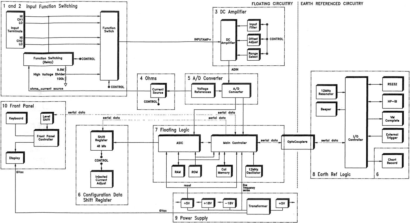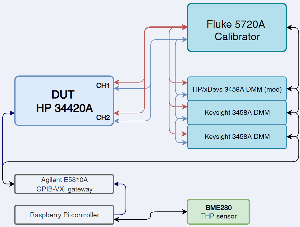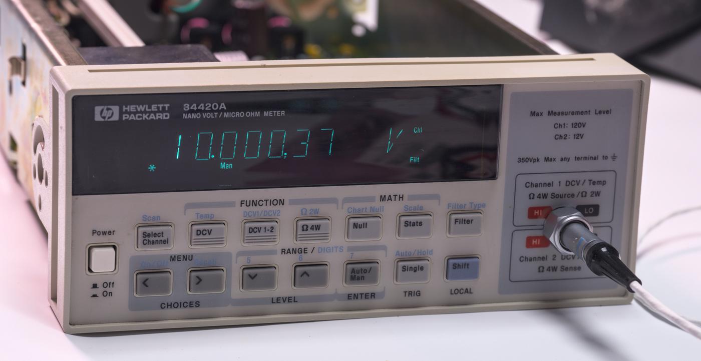 Model 34420A is also quite useful tool to calibrate conventional voltage standards such as solid-state zener-based 10 V sources such as Fluke 732 or Datron 4910. Overall HP 34420A is quite interesting instrument. It is essentially a refined HP 34401A but with good low-noise front end amplifier providing additional 1 mV, 10 mV and 100 mV DC ranges. These front-end improvements together with refined ADC operation were utilized to push resolution of 34420A to 7½ digits.
