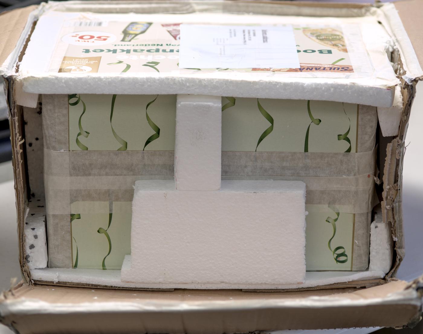 With opening we can reveal the second inner box, spaced around with styrofoam pads around. Idea here was to provide some bumper action and isolation of inner box from the shipping handling impacts.