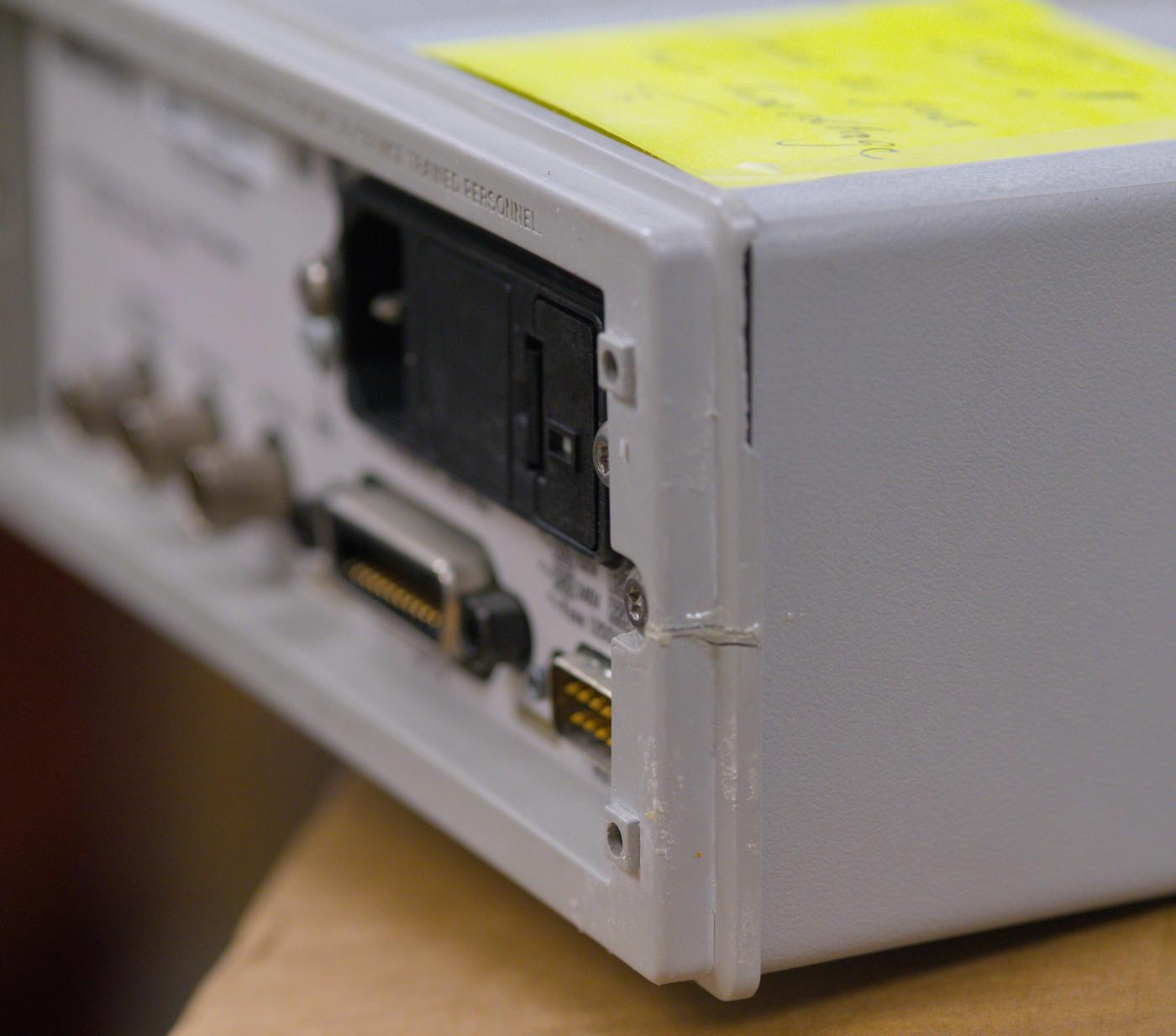 It’s not only cracked in half and epoxied together in repair attempt at the mount bolt point but also have busted up edges around. Many of the HP, Agilent and even newer Keysight instruments in half rack form-factor are using same rear bezels and they are not expensive to aquire as a replacement part. We’ll replace this bezel after instrument is restored to functional state.