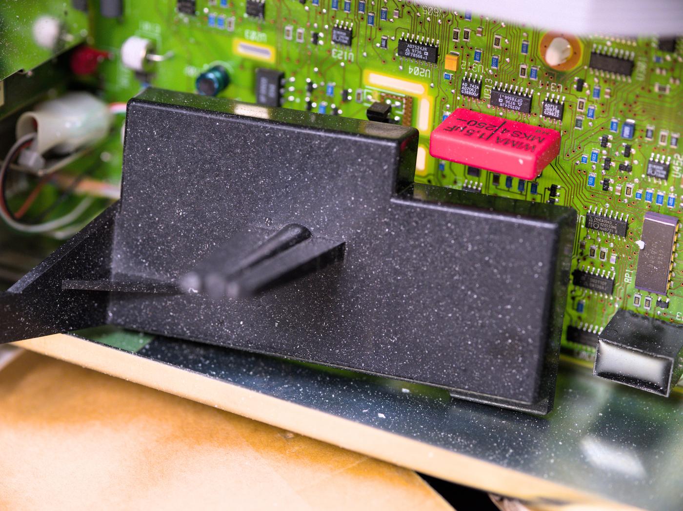 Removing bezel fastened with a pair of Torx T15 bolts and one grounding bolt of same size at the cover reveals the inner volume of the instrument. To my despair all the inside surfaces are also covered with fine styrofoam dust layer.