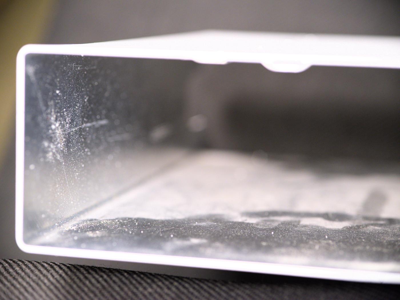 I could easily draw unhappy frowning faces on the cover inner surface. Whole instrument will require deep and careful cleaning to get rid of this, especially around sensitive nanovolt-type high impedance circuitry on PCBA.