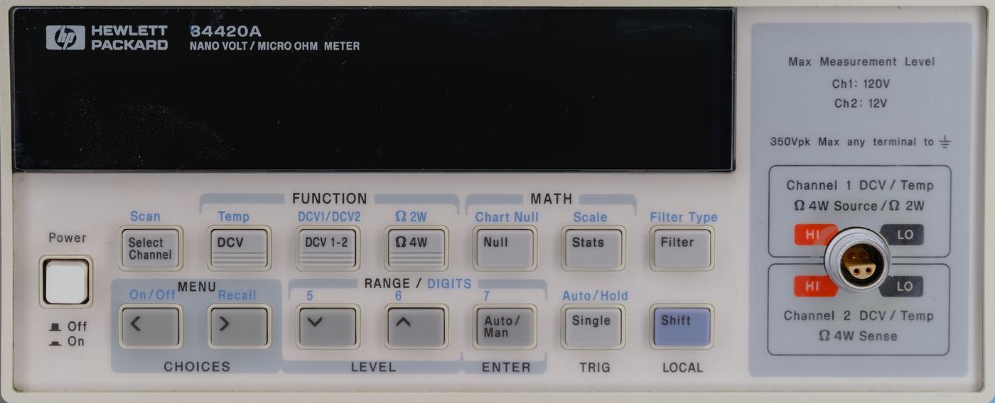 A/D for this nanovoltmeter is specified at 0.8 ppm of the reading + 0.5 ppm of the range. 34420A does not have AC voltage or DC/AC current measurement funtions but keeps resistance measurement functionality using all four input terminals. This resistance function is a significant feature that enables use of 34420A in applications such as automated leakage measurements for quantum voltage metrology in PJVS systems like NIST SRI 6000. Leakage measurements and evaluation is very important in this application as parasitic currents would essentially propagate into output voltage error at the PJVS terminals. 34420A also has pretty good thermometry functionality, supporting various SPRT, thermistors and thermocouples.