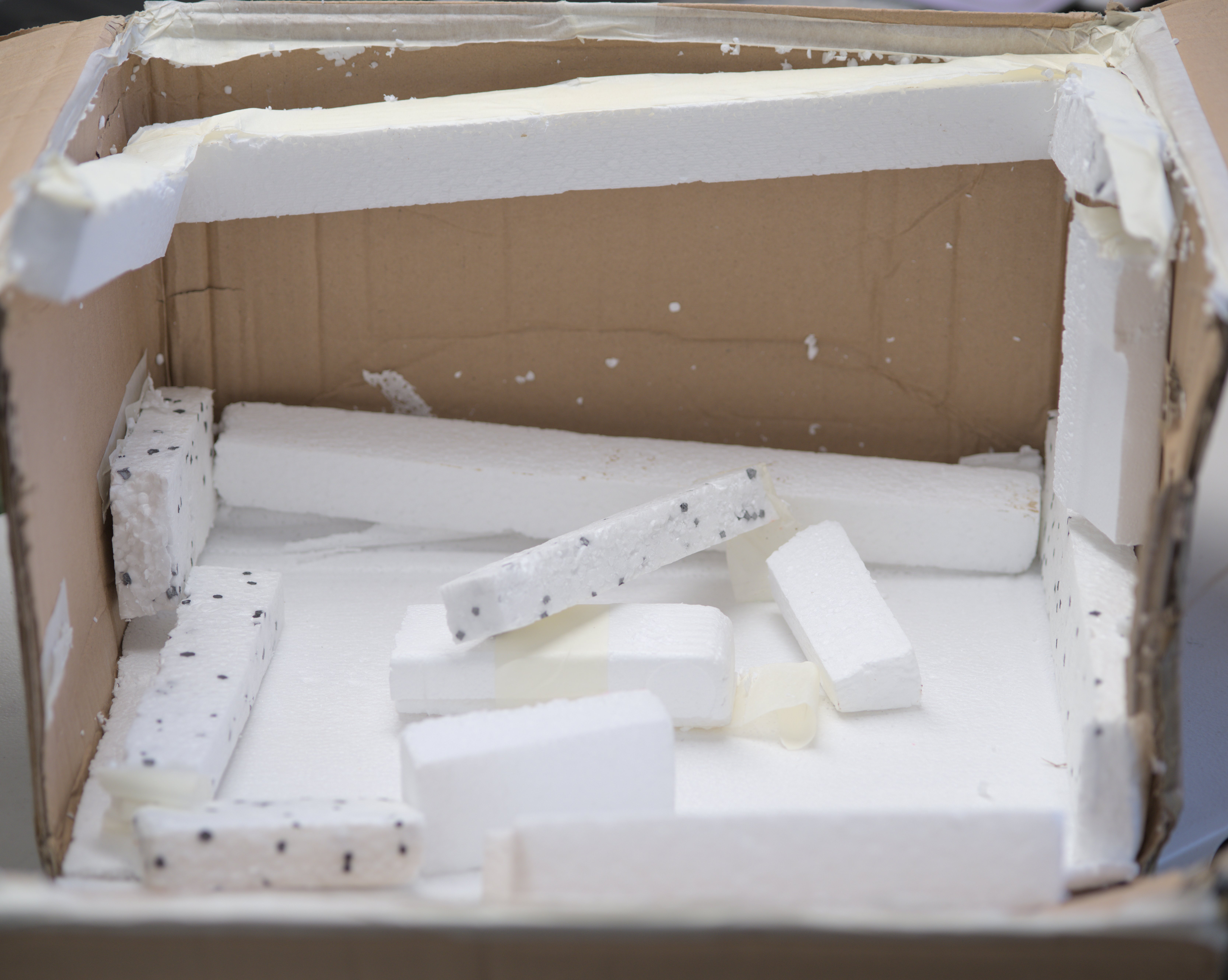 With opening we can reveal the second inner box, spaced around with styrofoam pads around. Idea here was to provide some bumper action and isolation of inner box from the shipping handling impacts.