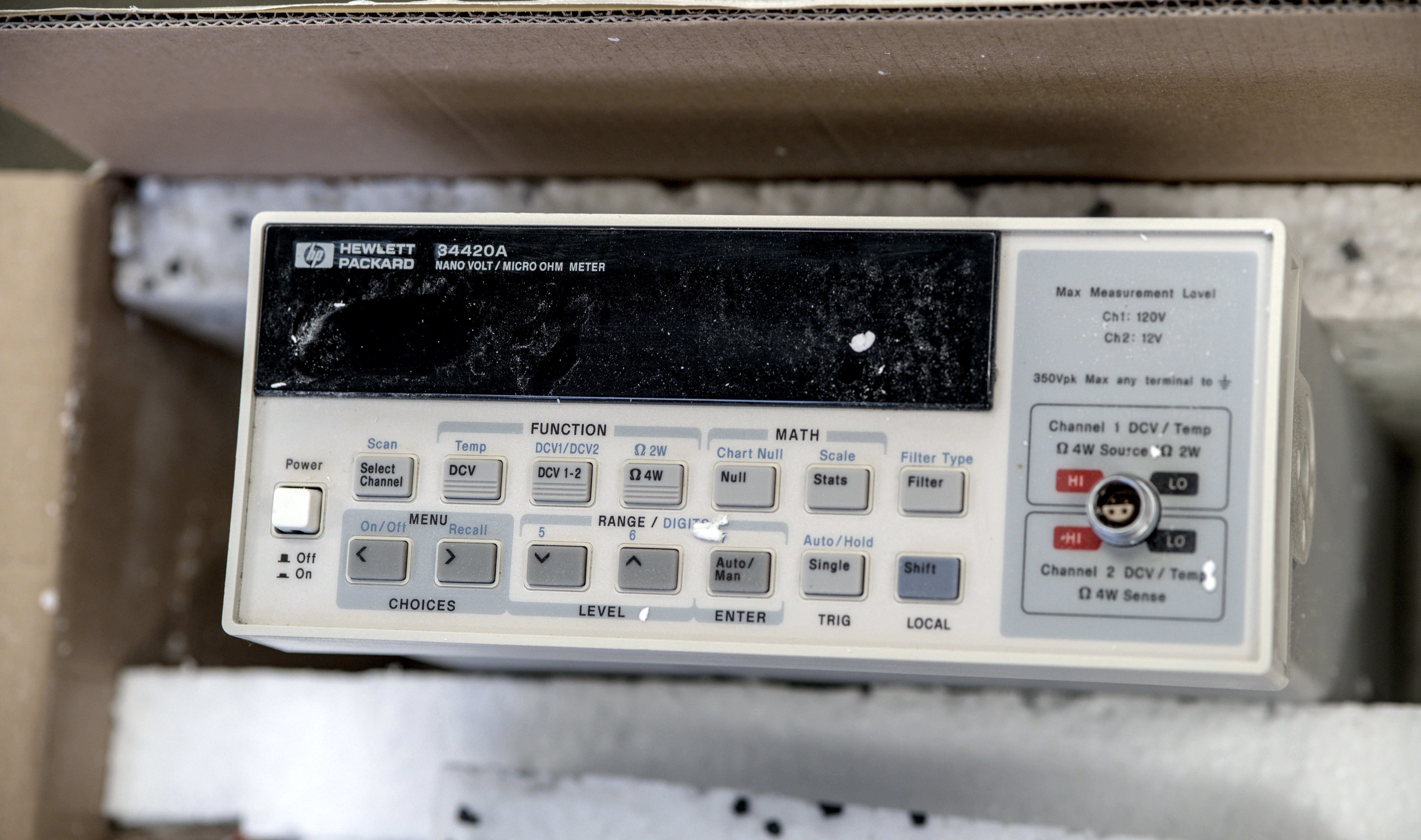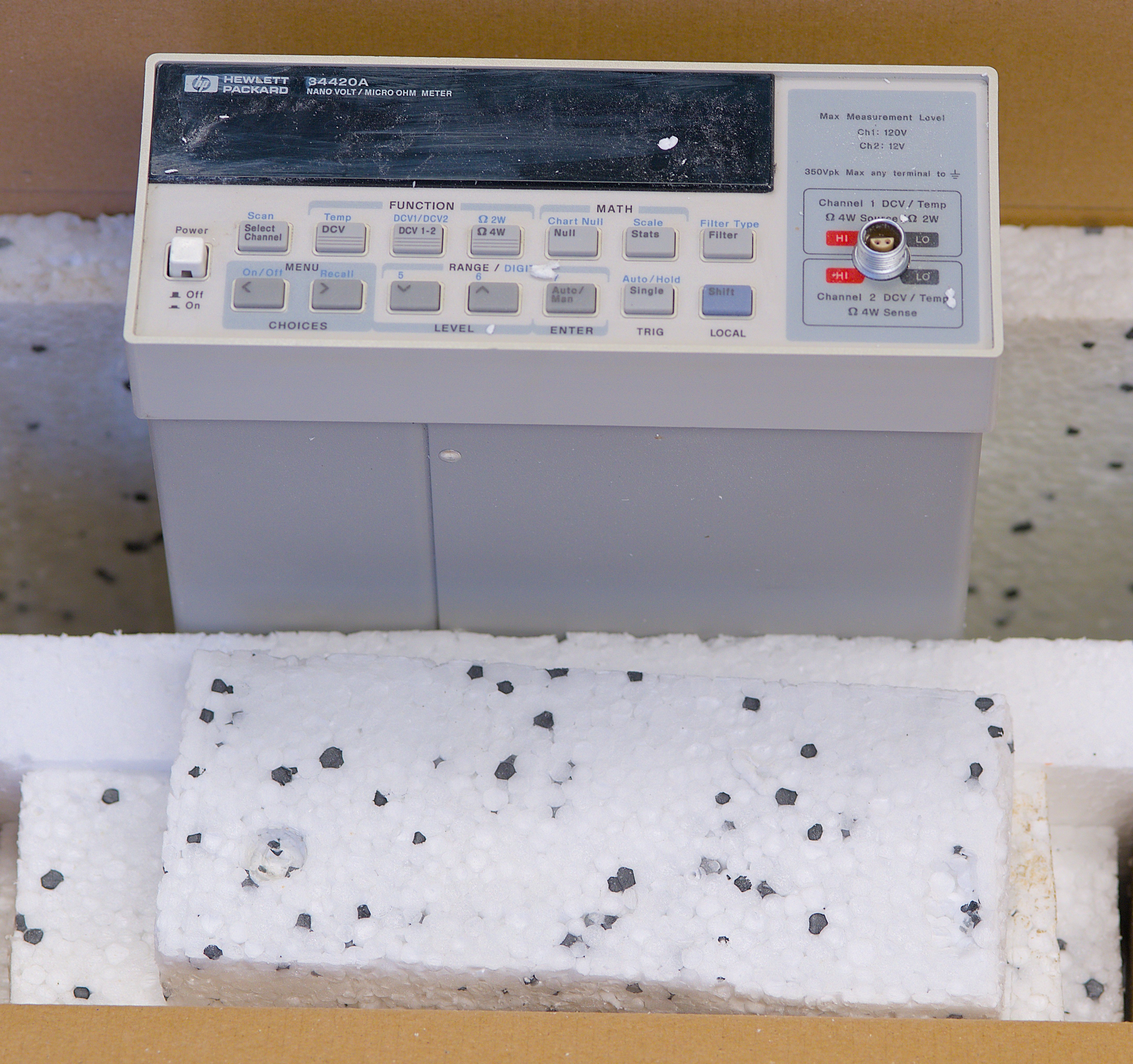 That rendered fine Styrofoam dust and particles all over the whole meter. It was deposited everywhere, poor expensive LEMO 1S input connector was jammed right into the styrofoam sheet. You can see the crated connector made in that sheet. Styrofoam is also acting as a nice ESD generator here.