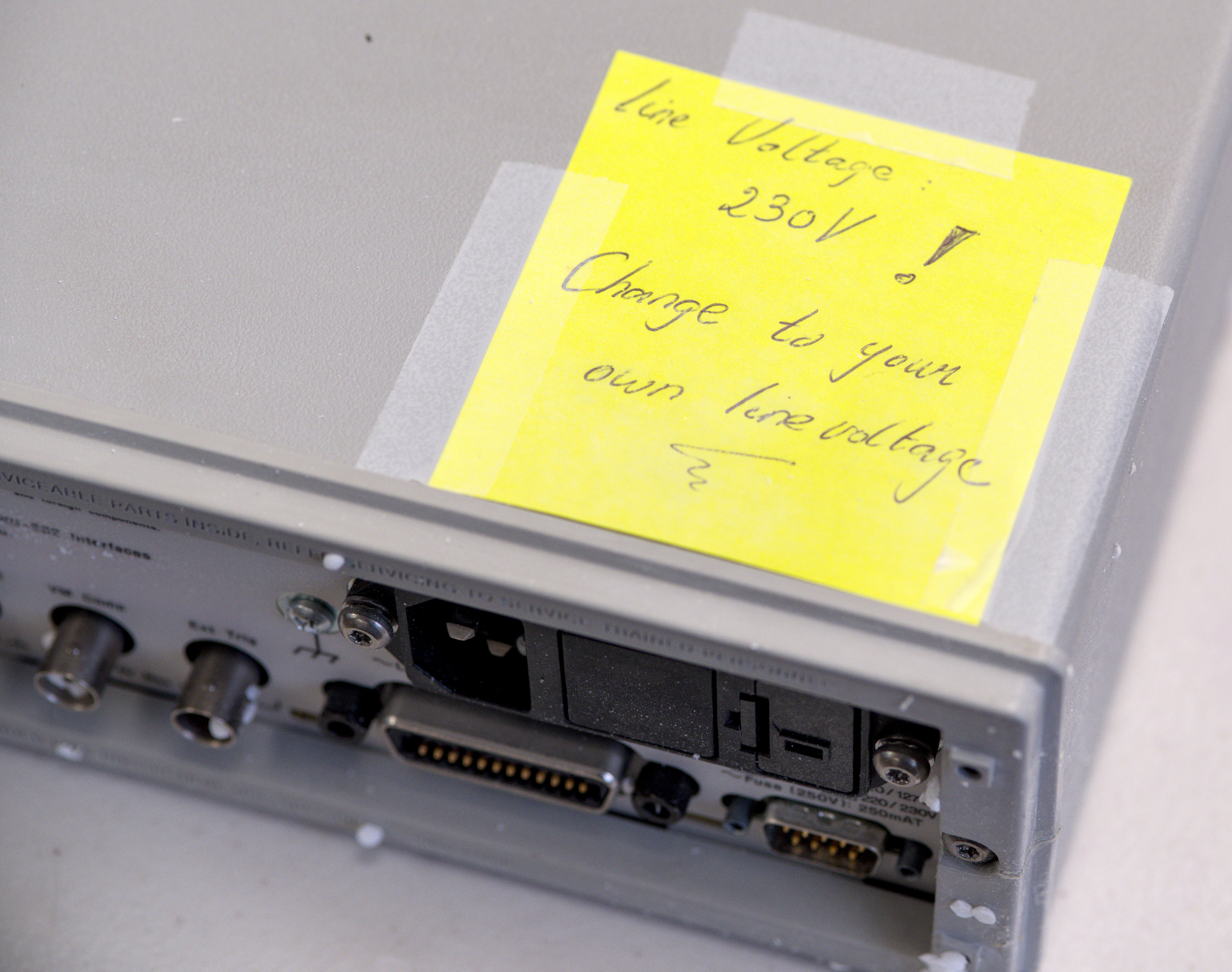 But we get a nice warning label about mains voltage level set to 230 V as a bonus. Thanks for that, useful reminder when shipping test equipment internationally. Usually the other way around is the dangerous one, sourcing 120V-preset equipment to the country with 230 V mains voltage.
