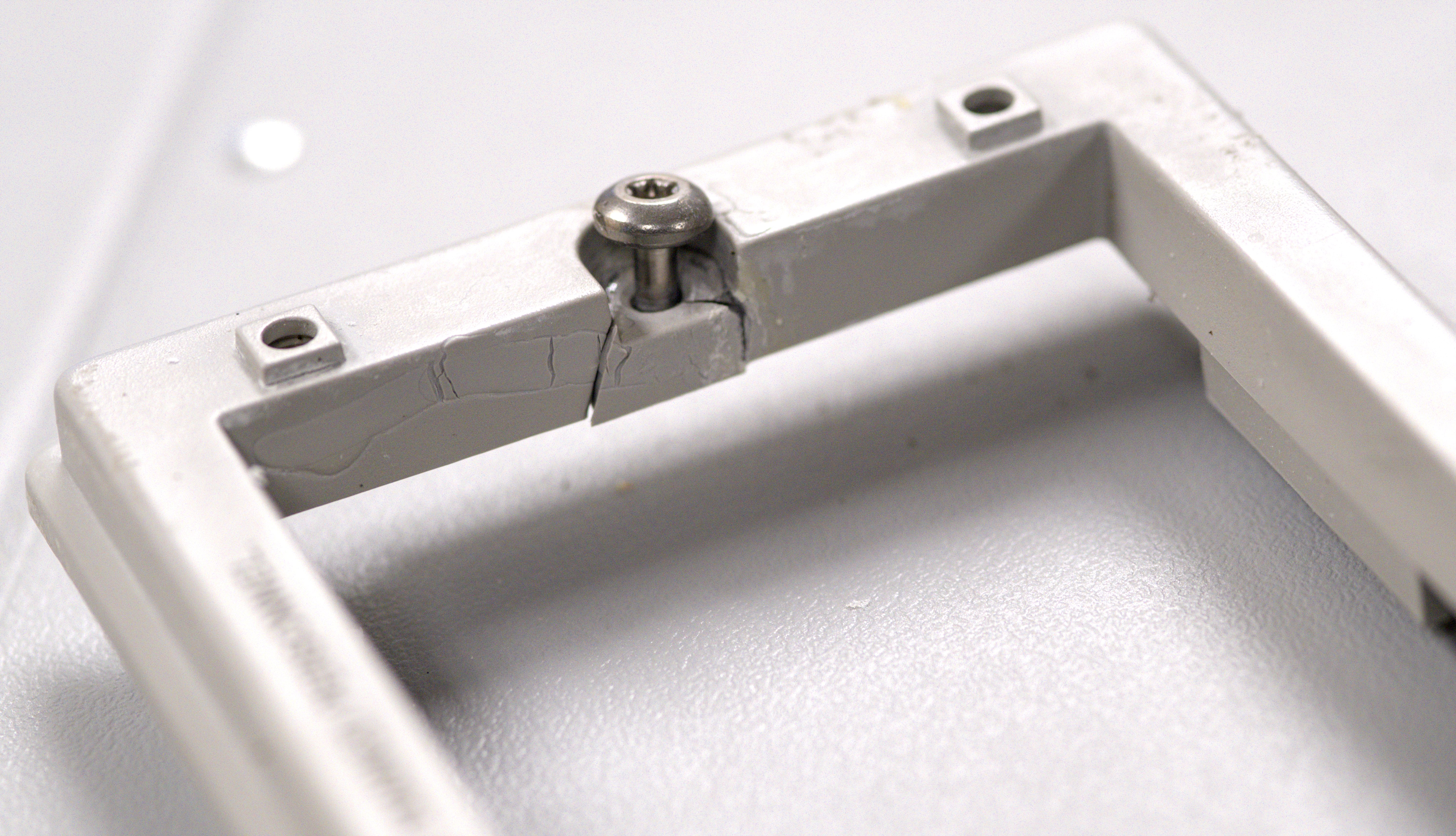 It’s not only cracked in half and epoxied together in repair attempt at the mount bolt point but also have busted up edges around. Many of the HP, Agilent and even newer Keysight instruments in half rack form-factor are using same rear bezels and they are not expensive to aquire as a replacement part. We’ll replace this bezel after instrument is restored to functional state.