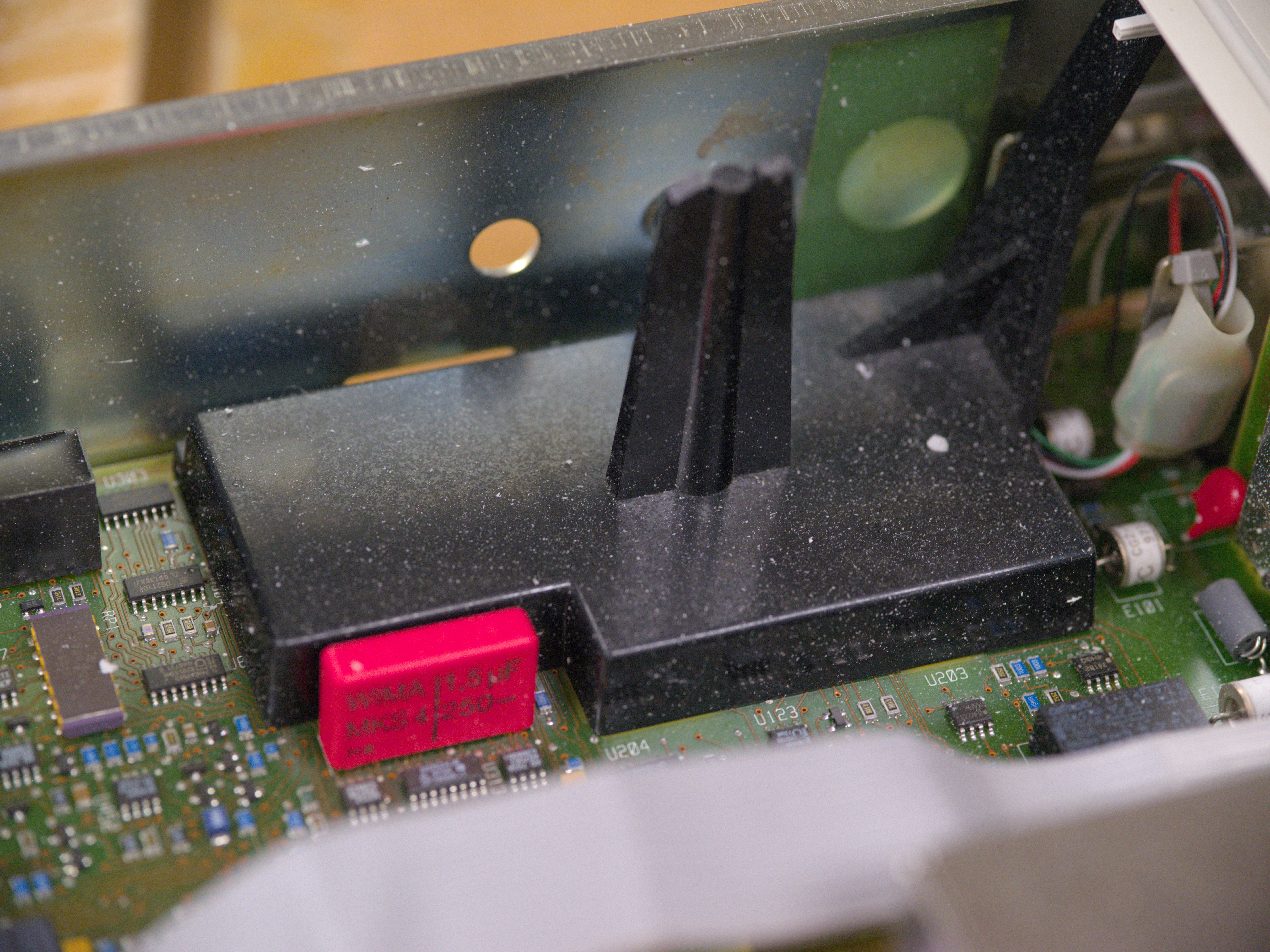 Removing bezel fastened with a pair of Torx T15 bolts and one grounding bolt of same size at the cover reveals the inner volume of the instrument. To my despair all the inside surfaces are also covered with fine styrofoam dust layer.