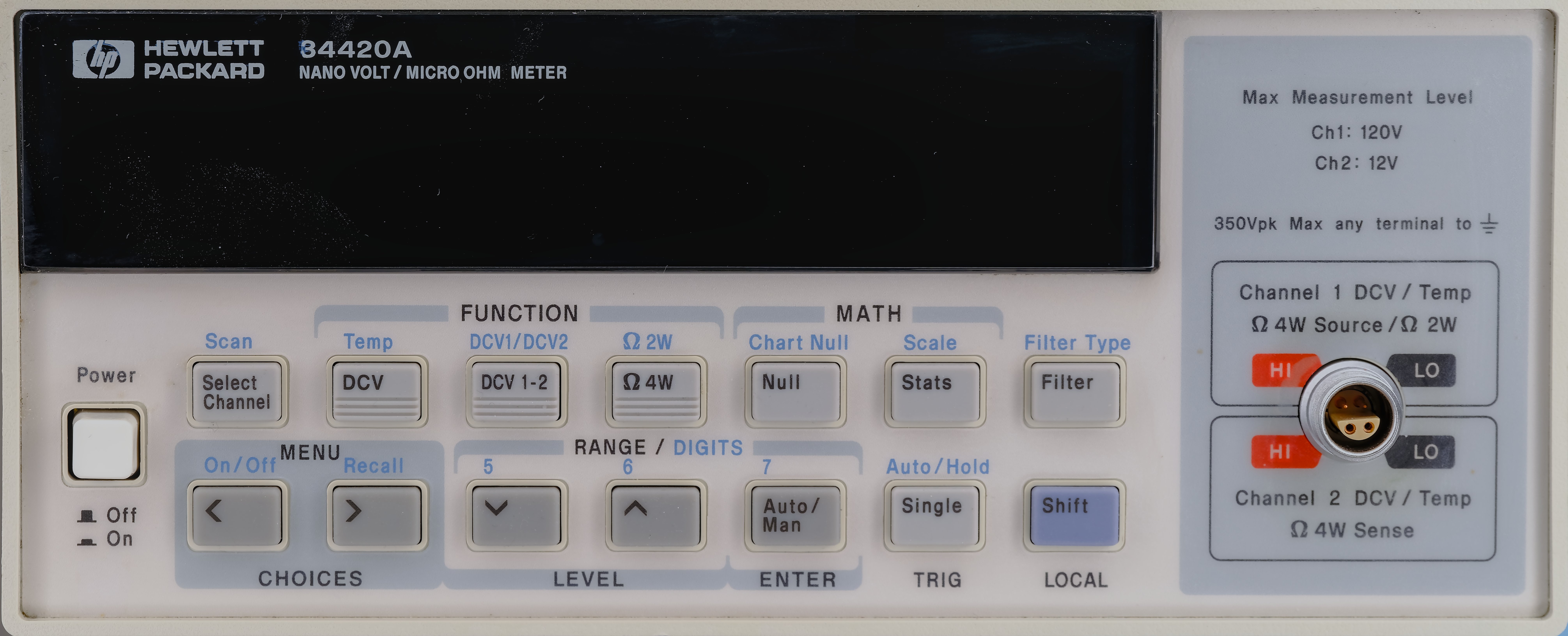Typical shrouded banana jack input connectors on 34420A are replaced instead with more serious (and expensive) LEMO EVP.1S.304 sealed bare-copper connector to provide four contacts for dual channel operation. 34420A is a current product and still being manufactured at MY and SG sites pretty much unchanged by the Keysight Technologies. Brand new nanovoltmeter would set you back at least for $7760 USD. Standard calibration for 34420A is about $1730 USD. Only alternative instrument in this class is Tektronix/Keithley 2182A nanovoltmeter for similar price at $6160 USD and without resistance measurement functionality. These instruments are quite popular and go for few k$ even used on secondary market, especially if calibration is available.