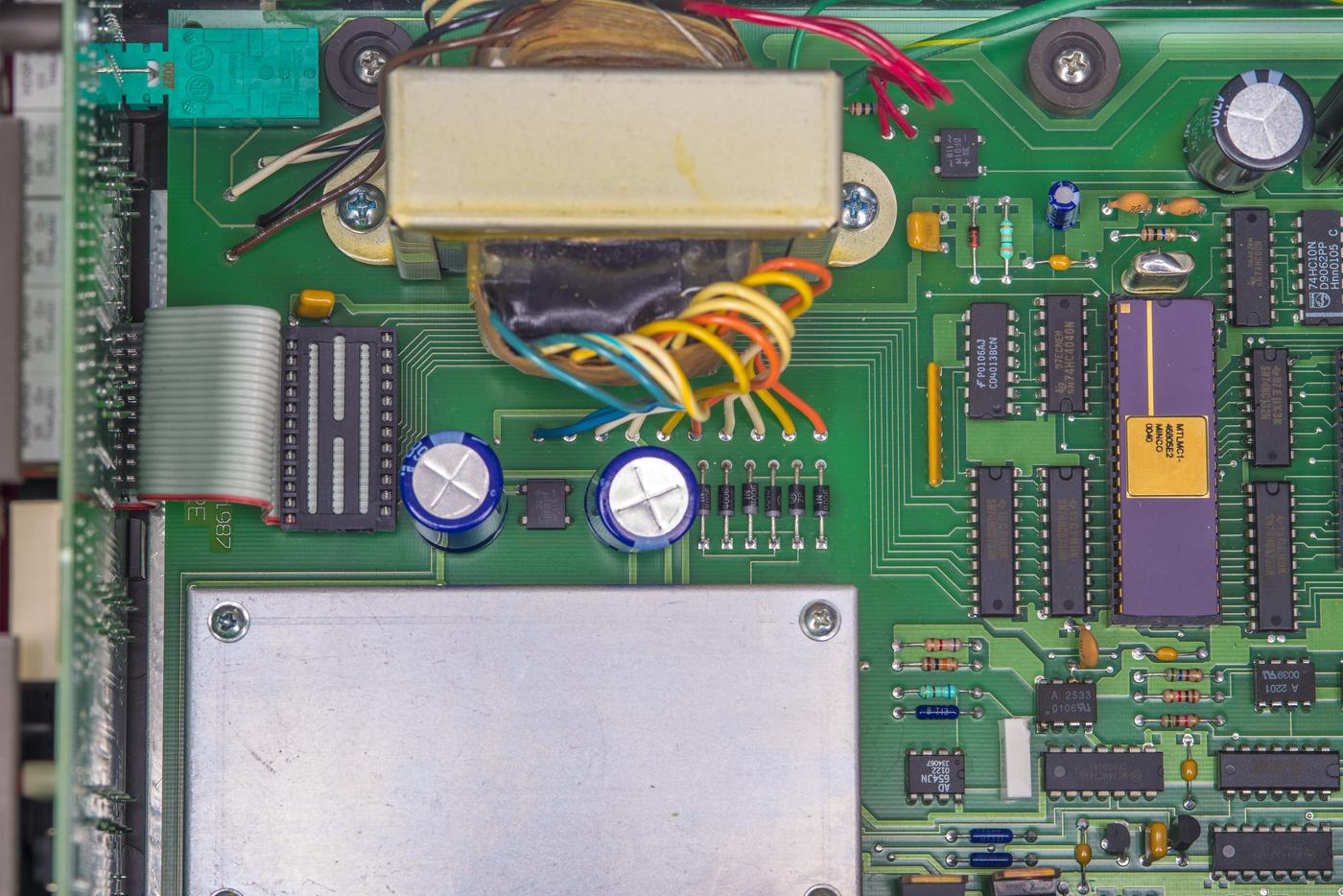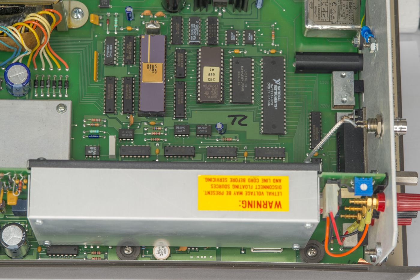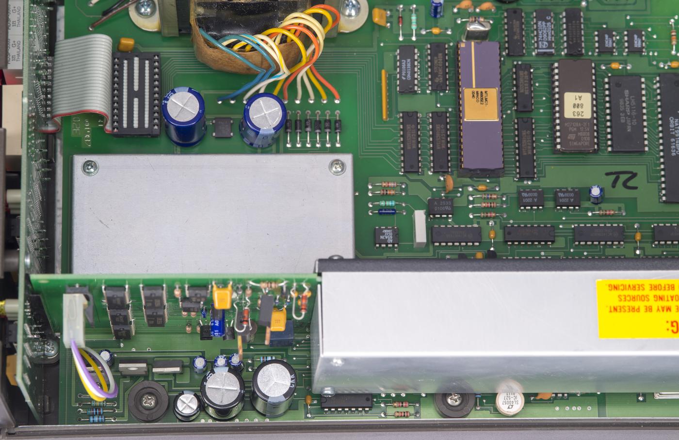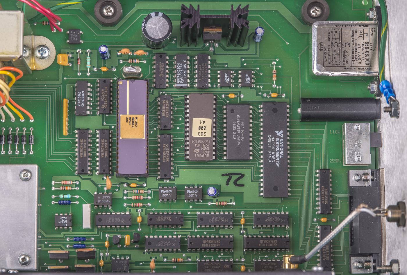 Main processor is 6805 in nice ceramic package with golden lid. Group of 74-series logic devices around provide various digital signals and interfaces. Main firmware is stored in socketed STM M27128A-2F1.