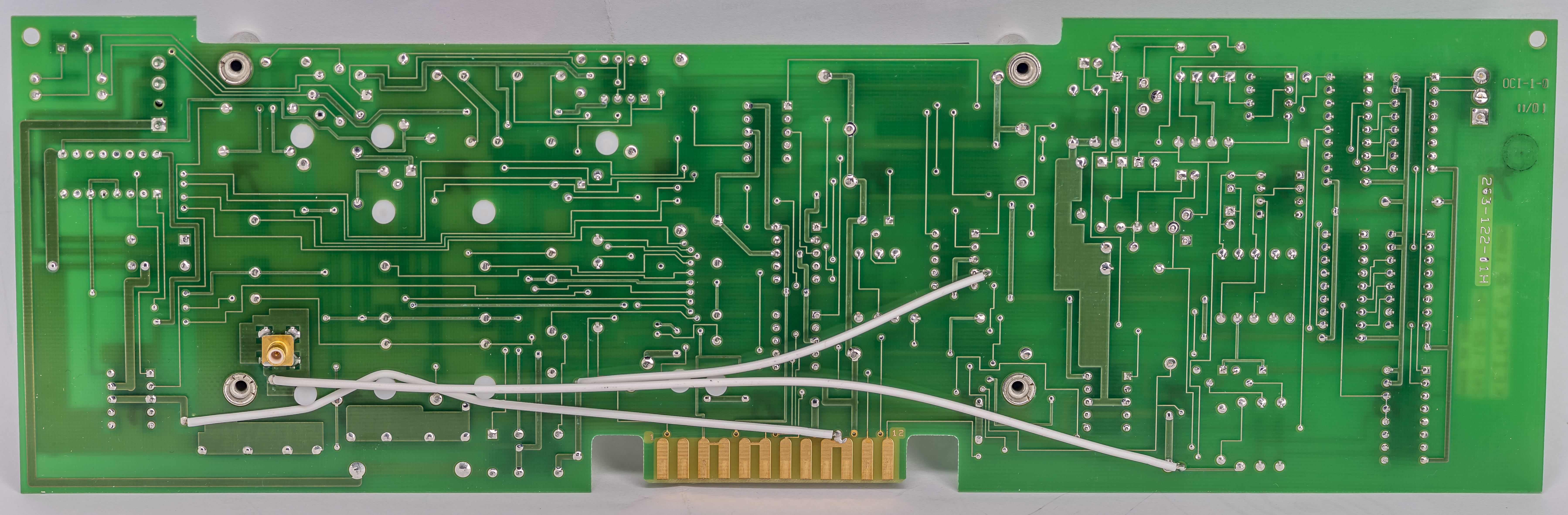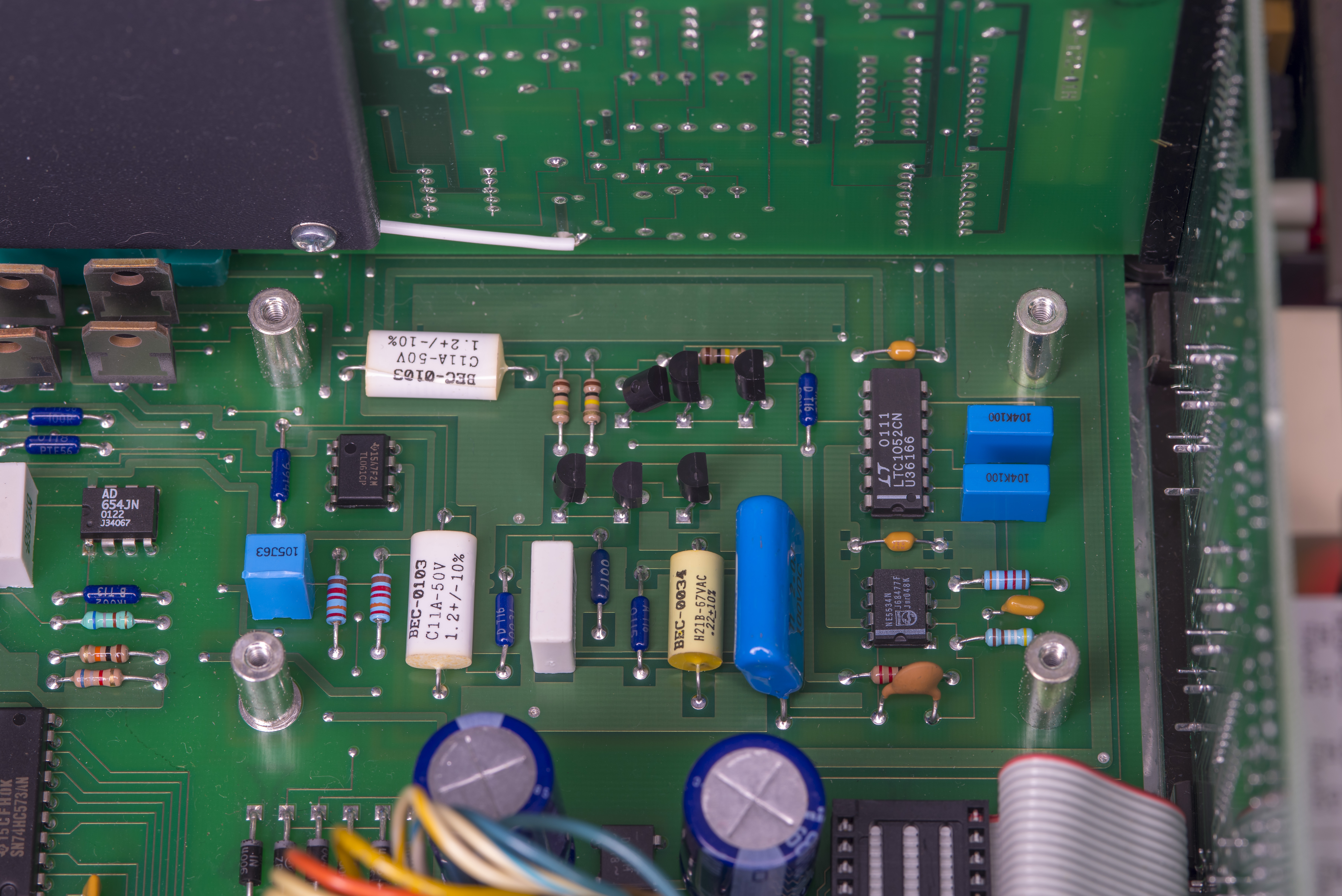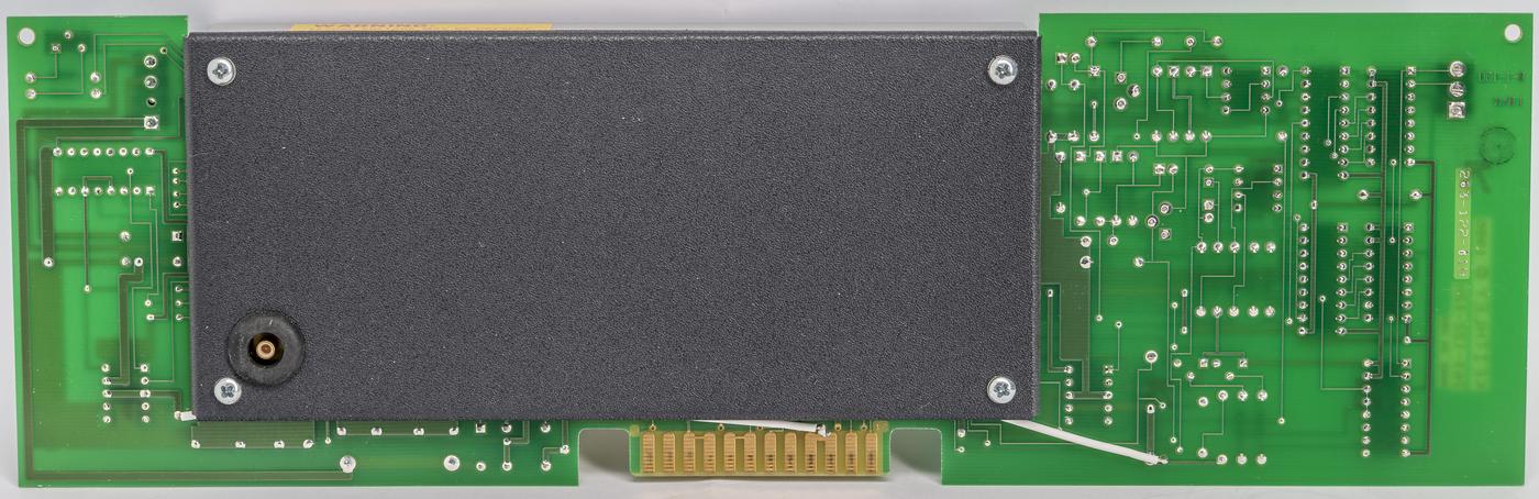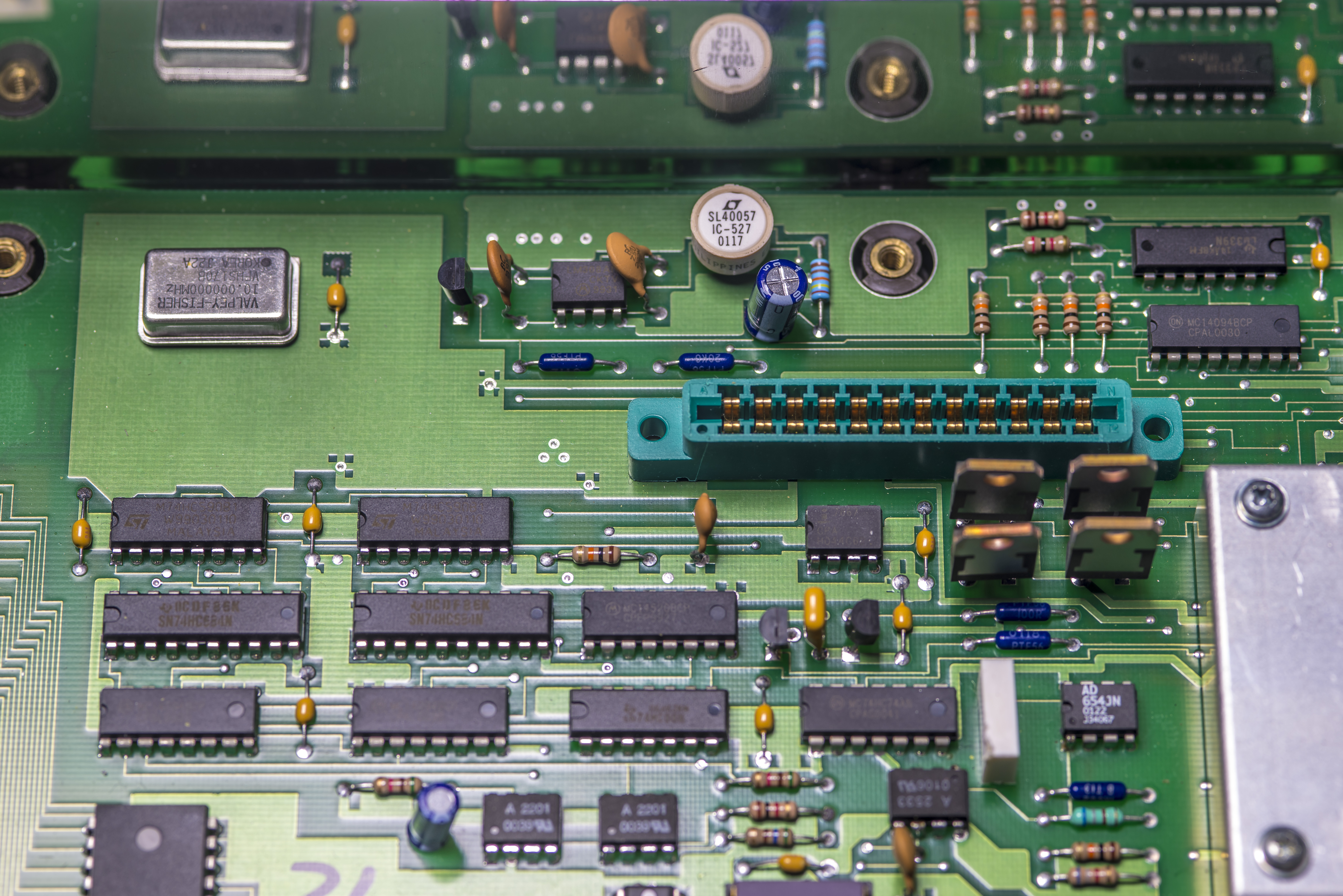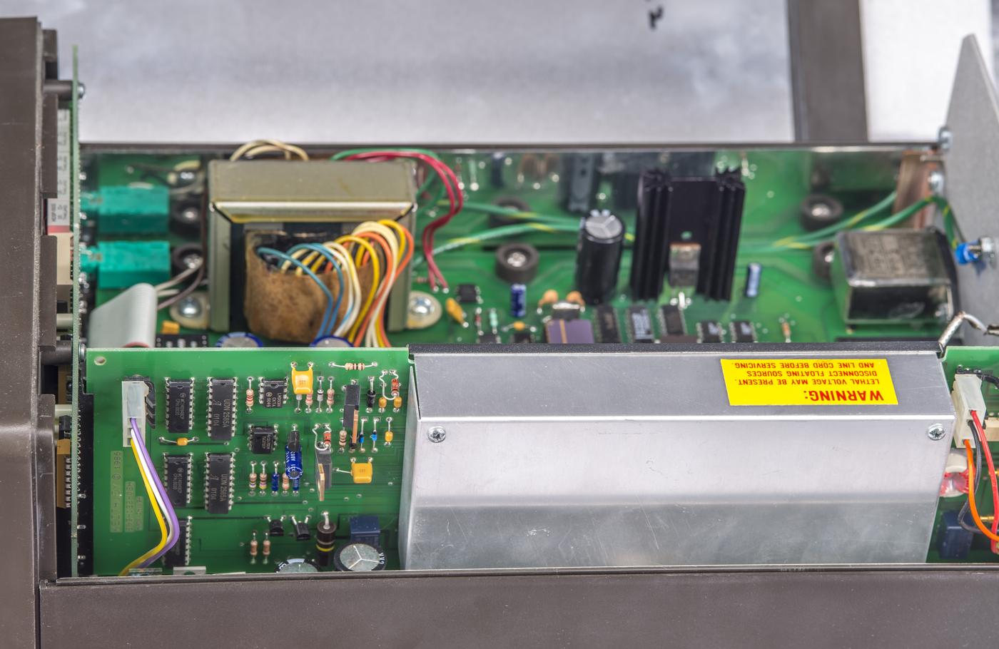 Main processor is 6805 in nice ceramic package with golden lid. Group of 74-series logic devices around provide various digital signals and interfaces. Main firmware is stored in socketed STM M27128A-2F1.