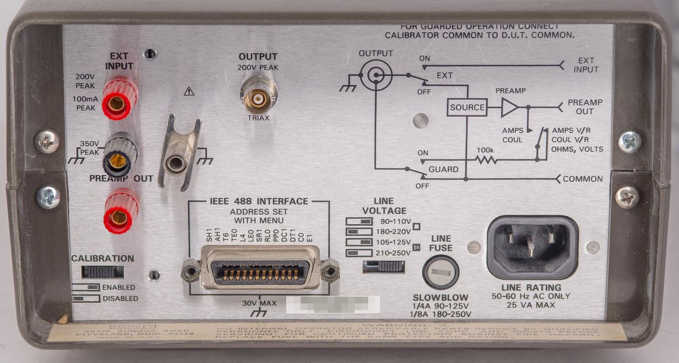 Calibrator/source has triaxial interface but with obsolete now 2-lug type receptacle. 263 has internal voltage source for level up to ±19.9995 V DC but accepts external voltage source up to ±200 V peak with 100 mA maximum compliance. On the back we can also find common IEEE-488 GPIB interface port, AC mains voltage selector switch, calibration lock-down switch and transimpedance preamplifier analog output for external plotter/digitizer. Both LO and chassis ground are available for various interconnect options.