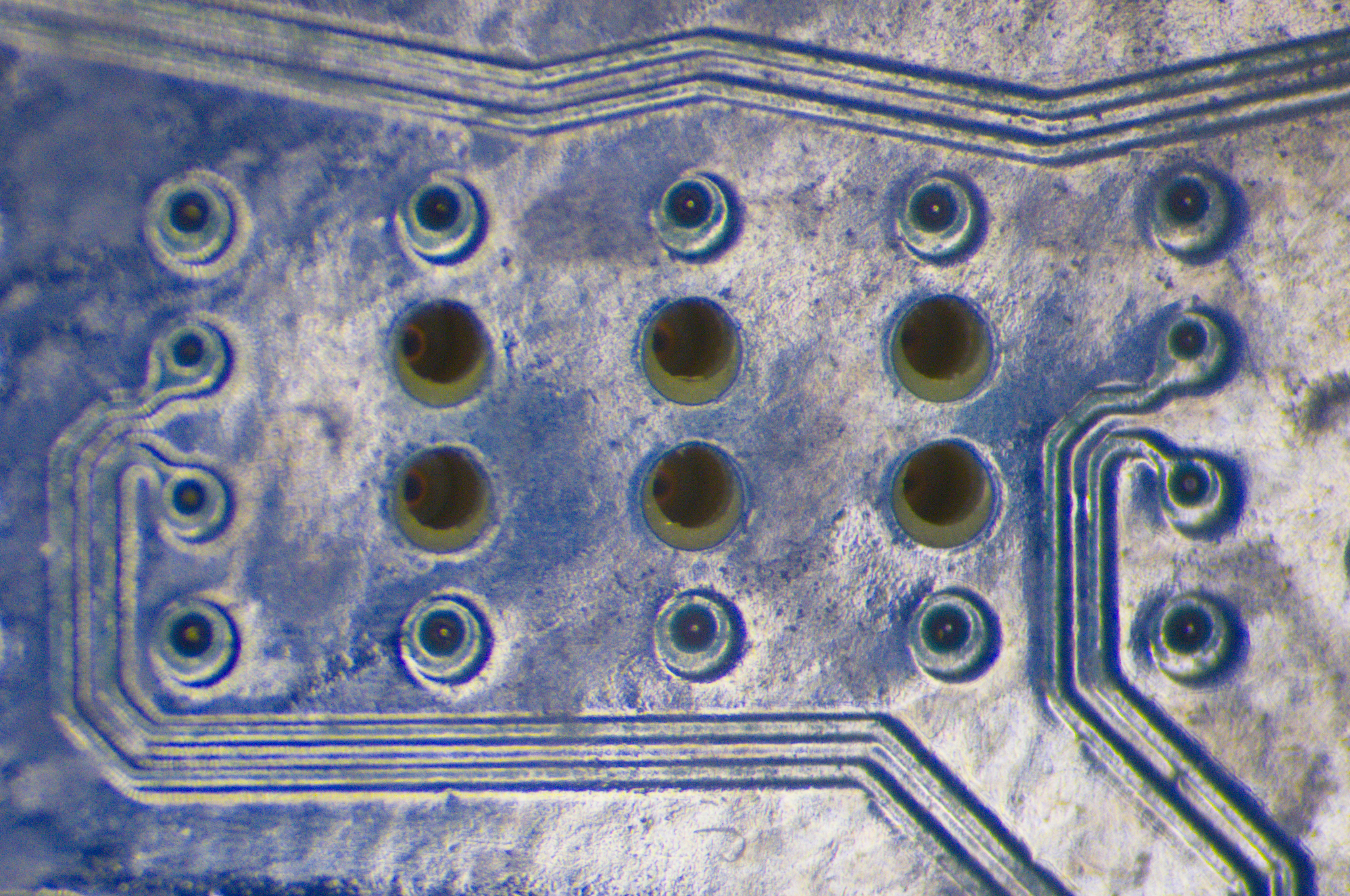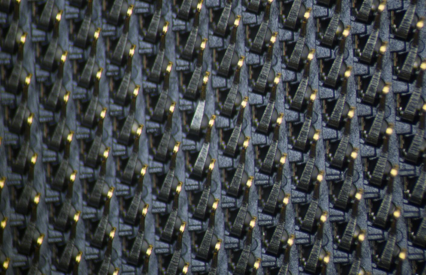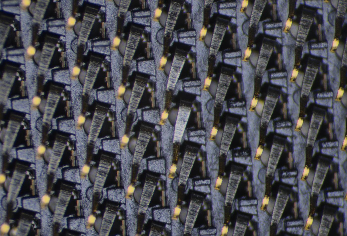 Socket pins under microscope prior to bending them back into alignment with the others: