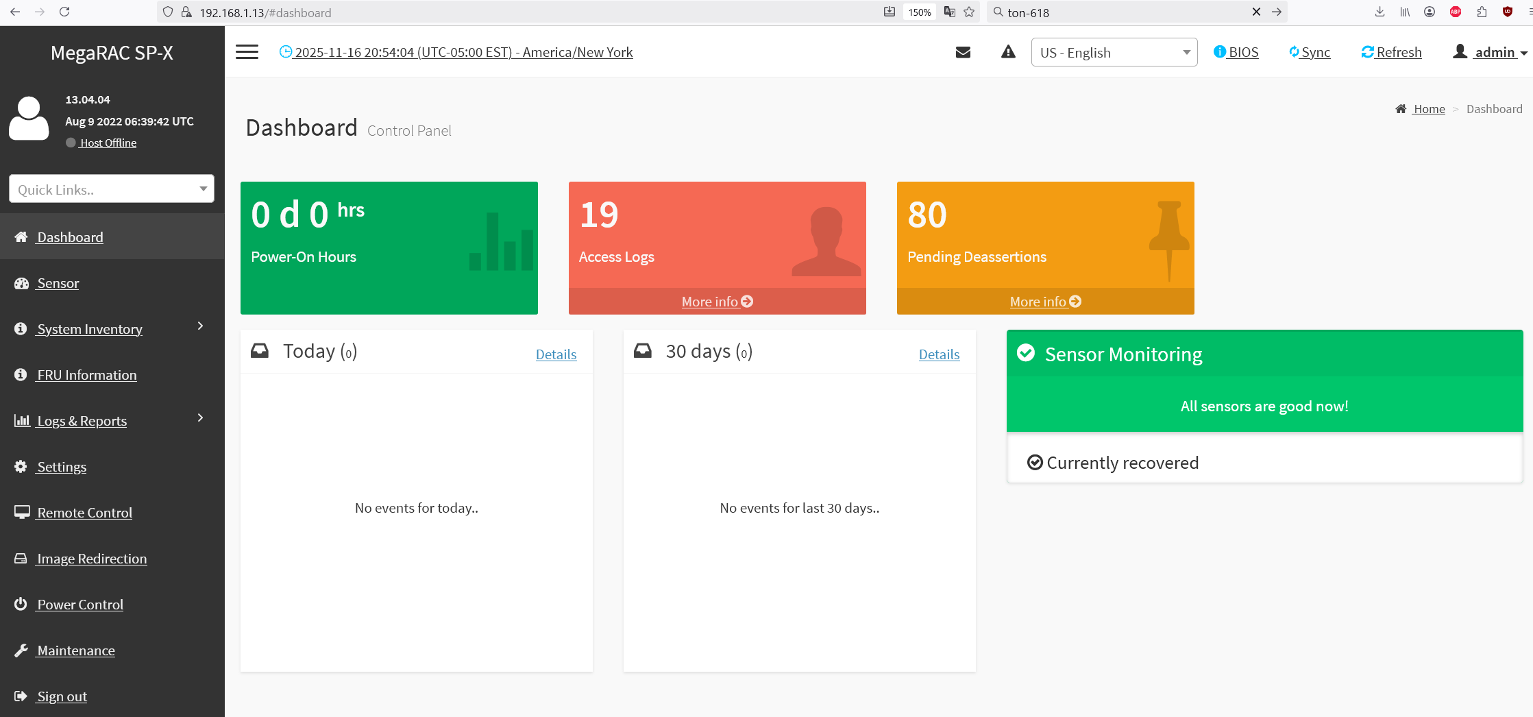 Now that physical damages are patched up, I went to connect my EVGA NEX 1500W ATX power supply and see what would happen. Ideally BMC should operate even without the CPU or rest of hardware since it’s running it’s own management microprocessor and dedicated memory chip that we can see near the ASPEED ASIC. After PSU connection Chroma AC source show combined power draw ~16 W and BMC green LED started blinking. Connected RJ45 LAN cable to BMC dedicated port and got activity with good link. Scanning network revealed new machine on 192.168.1.13 address and going there with HTTPS browser revealed working BMC GUI. Great progress, I’d say.