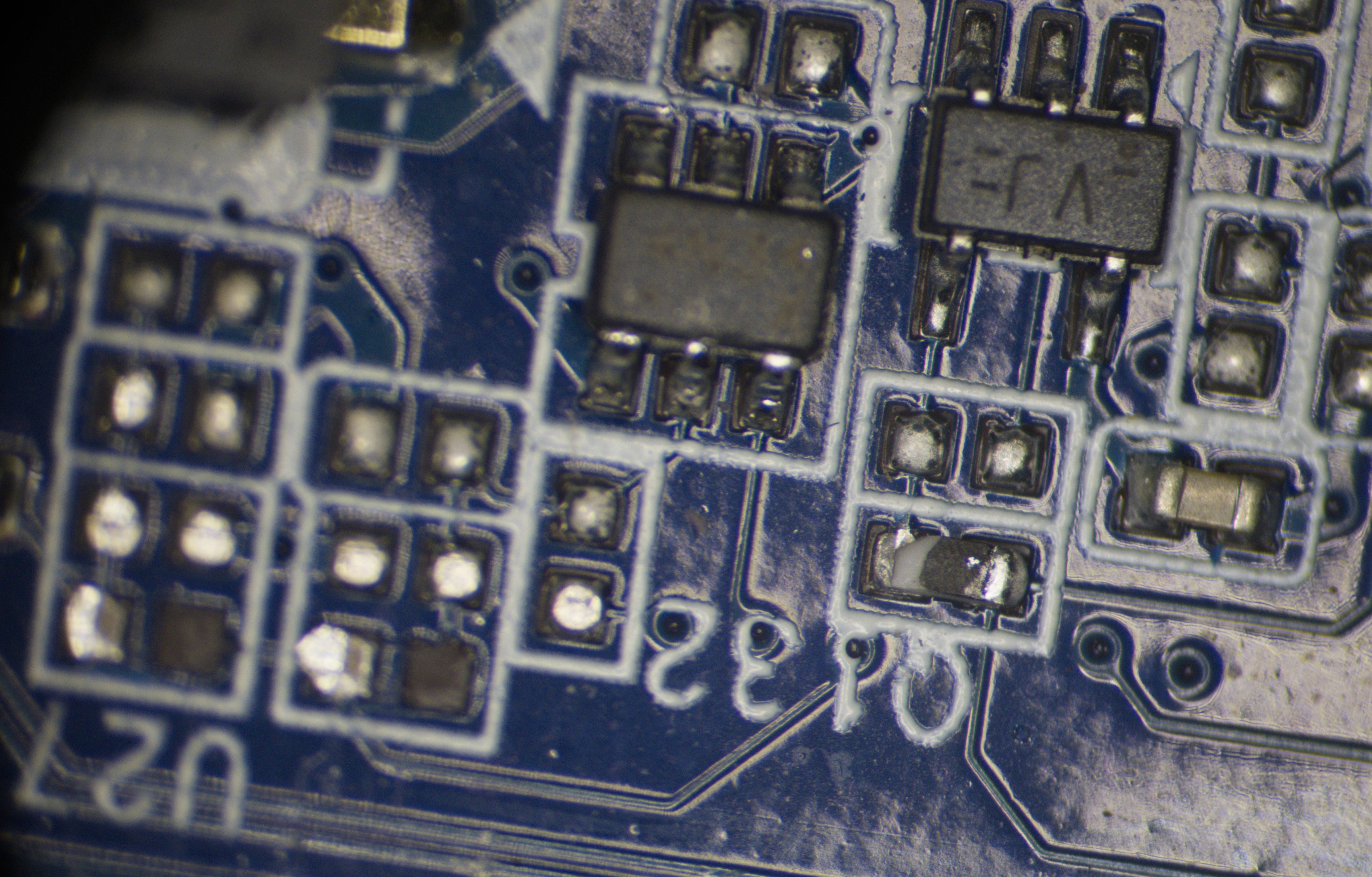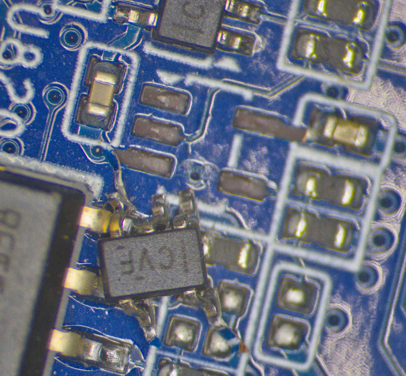 Bit closer look. Poor chip is a Texas Instruments SN74LVC1G07DCKR logic gate, but it’s still here so I’ll just move it carefully back where it supposed to be.