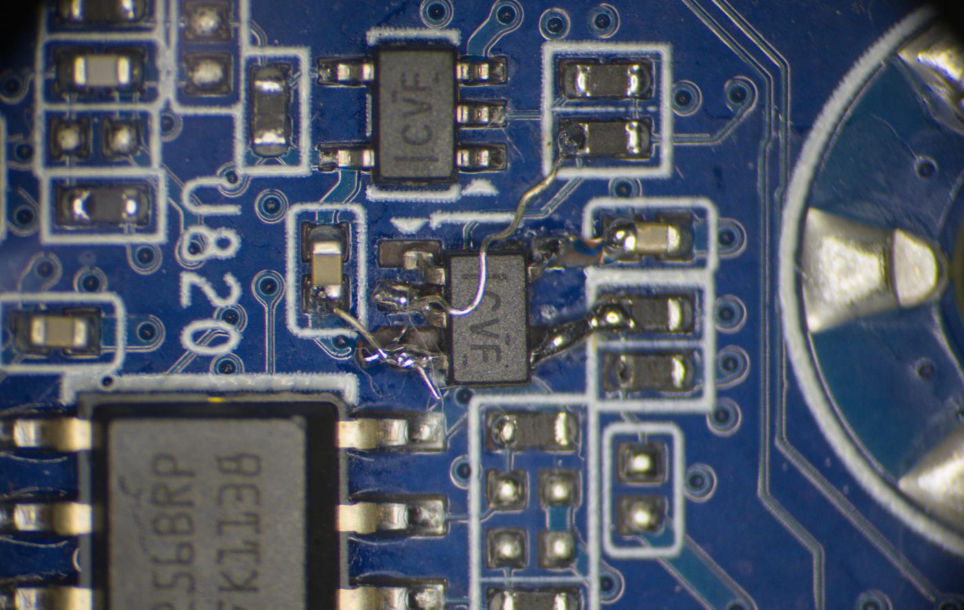 I tried to find any good photos of this area online but best I could get from potato-resolution images online is two probably 0402 resistors that were supposed to be there? Anyhow, here’s the original chip doctored back into place and jumpwired to restore electrical connections: