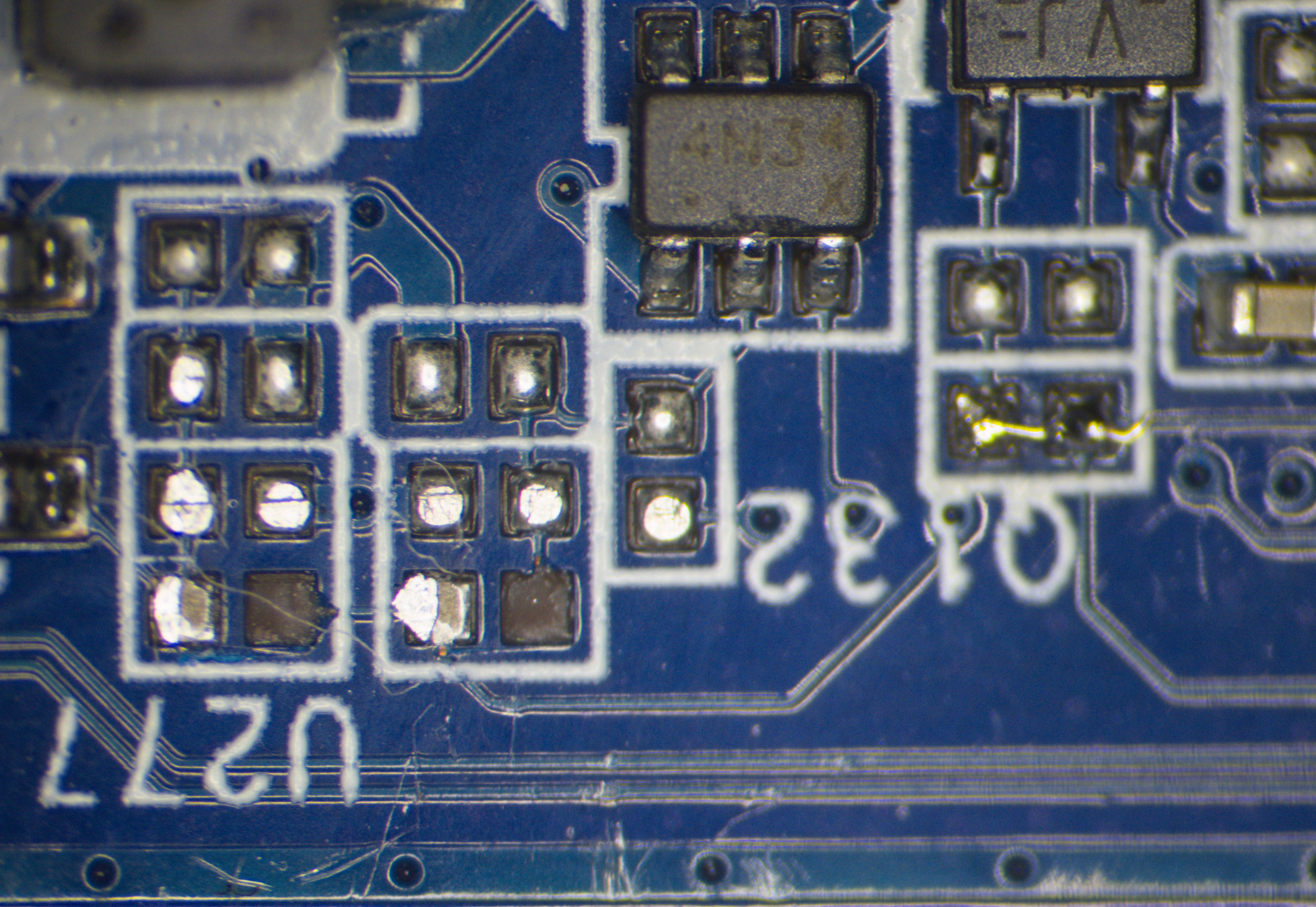 And shorted resistor pads where 0.3 remnant was, prior to installing two 10 kΩ guesstimate 0402 resistors on missing pads? I saw another “4N3” marked 6-pin SMD IC nearby and it had two 10 kΩ resistors and one 0 Ω connected to it. So I’ll just do similar with 2 × 10 kΩ in damaged area near U277.