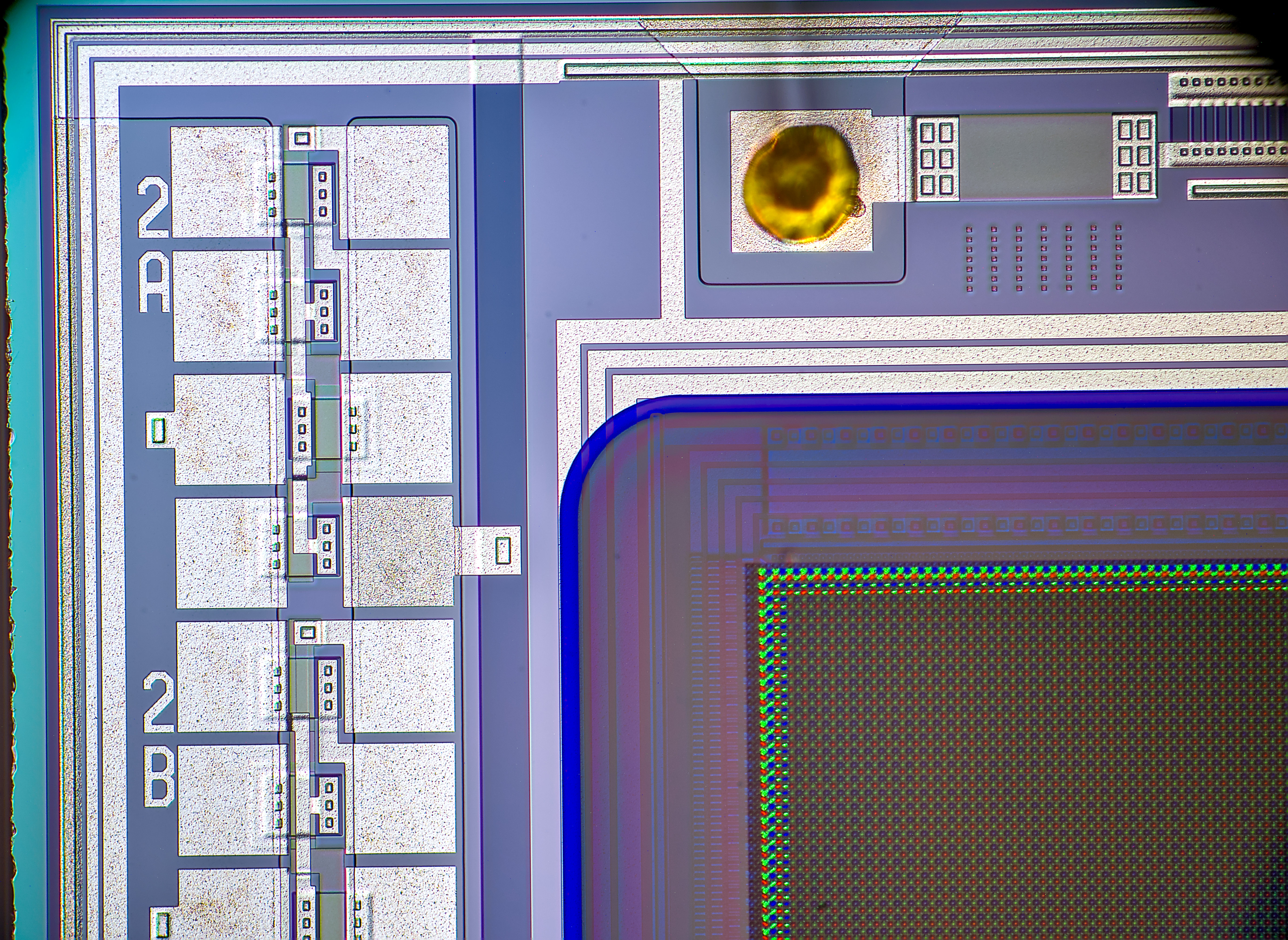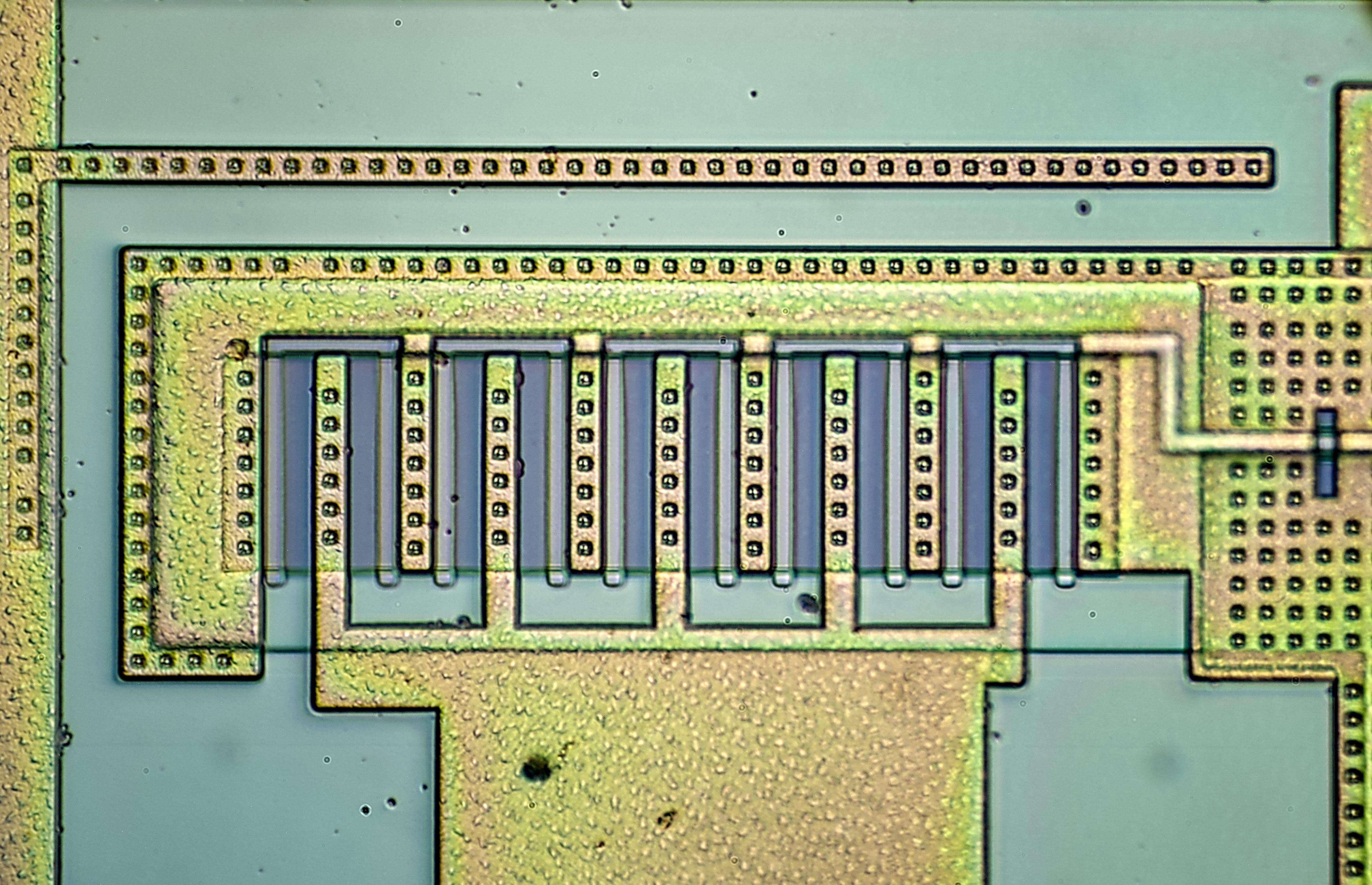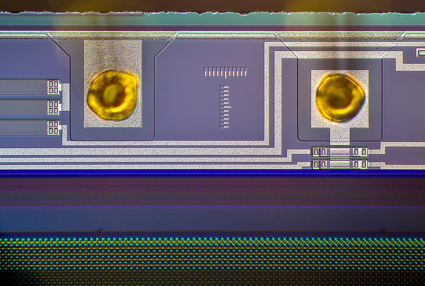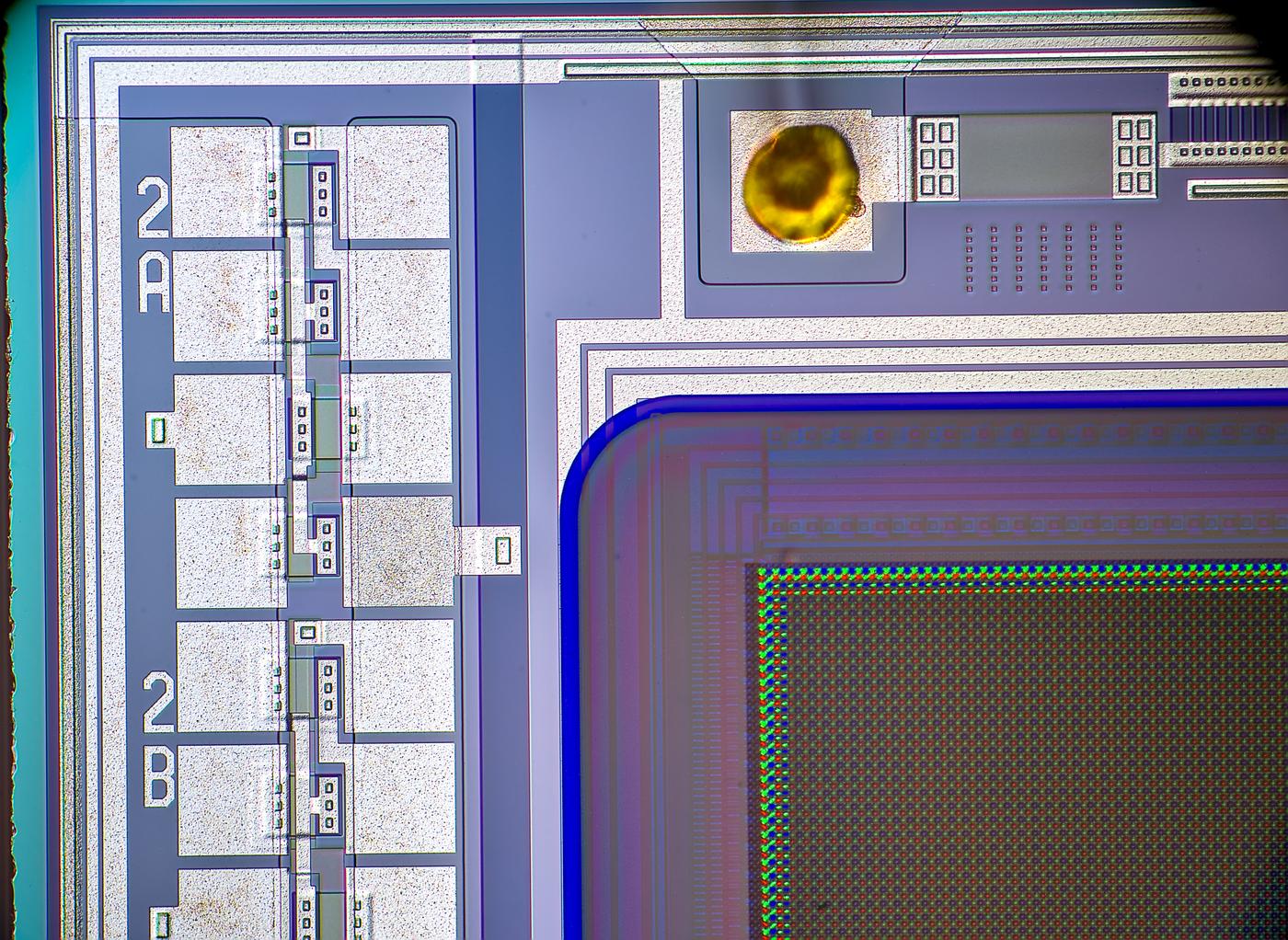 Focus-stacked image of larger transistor structure, with clearly visible squares around.