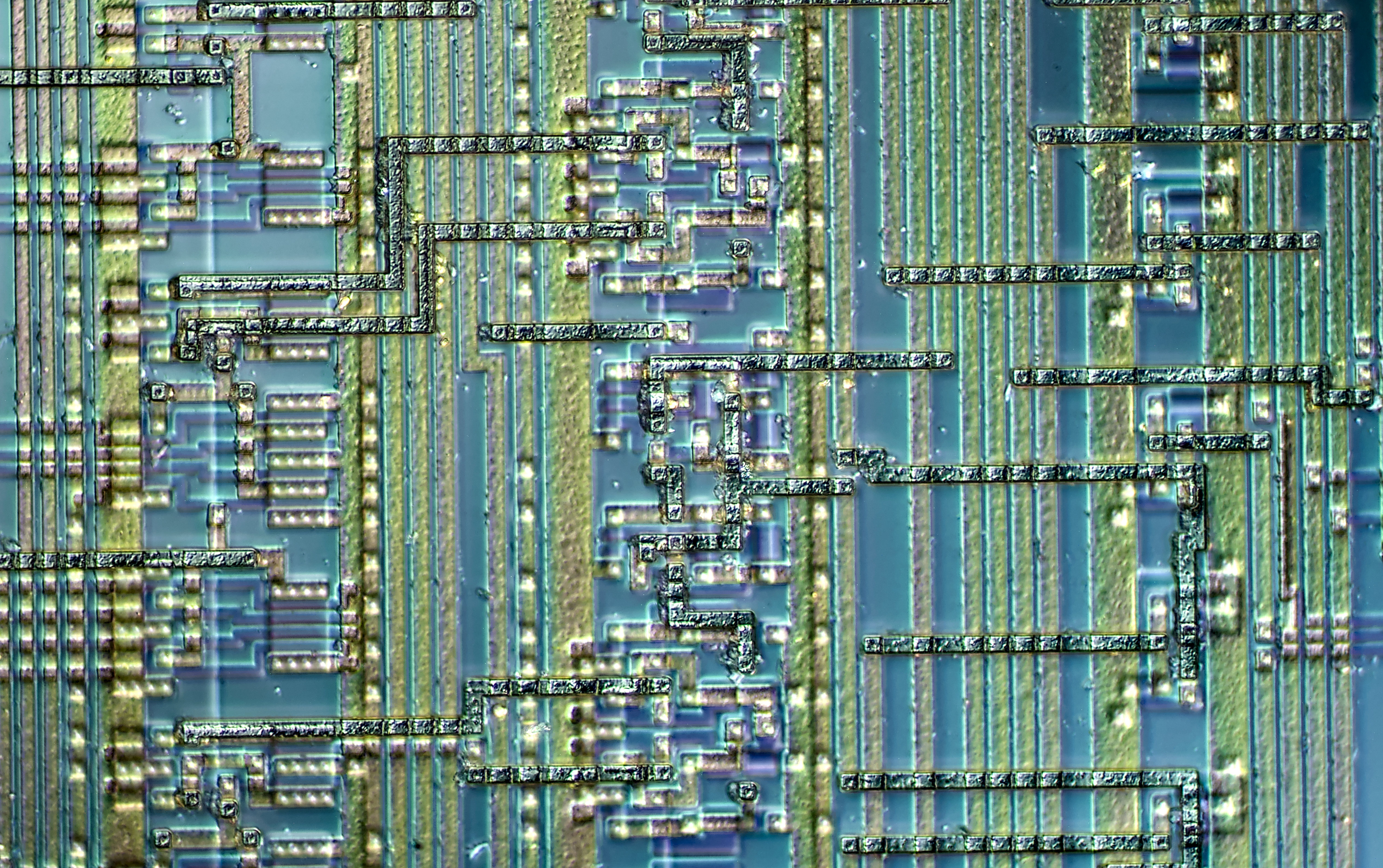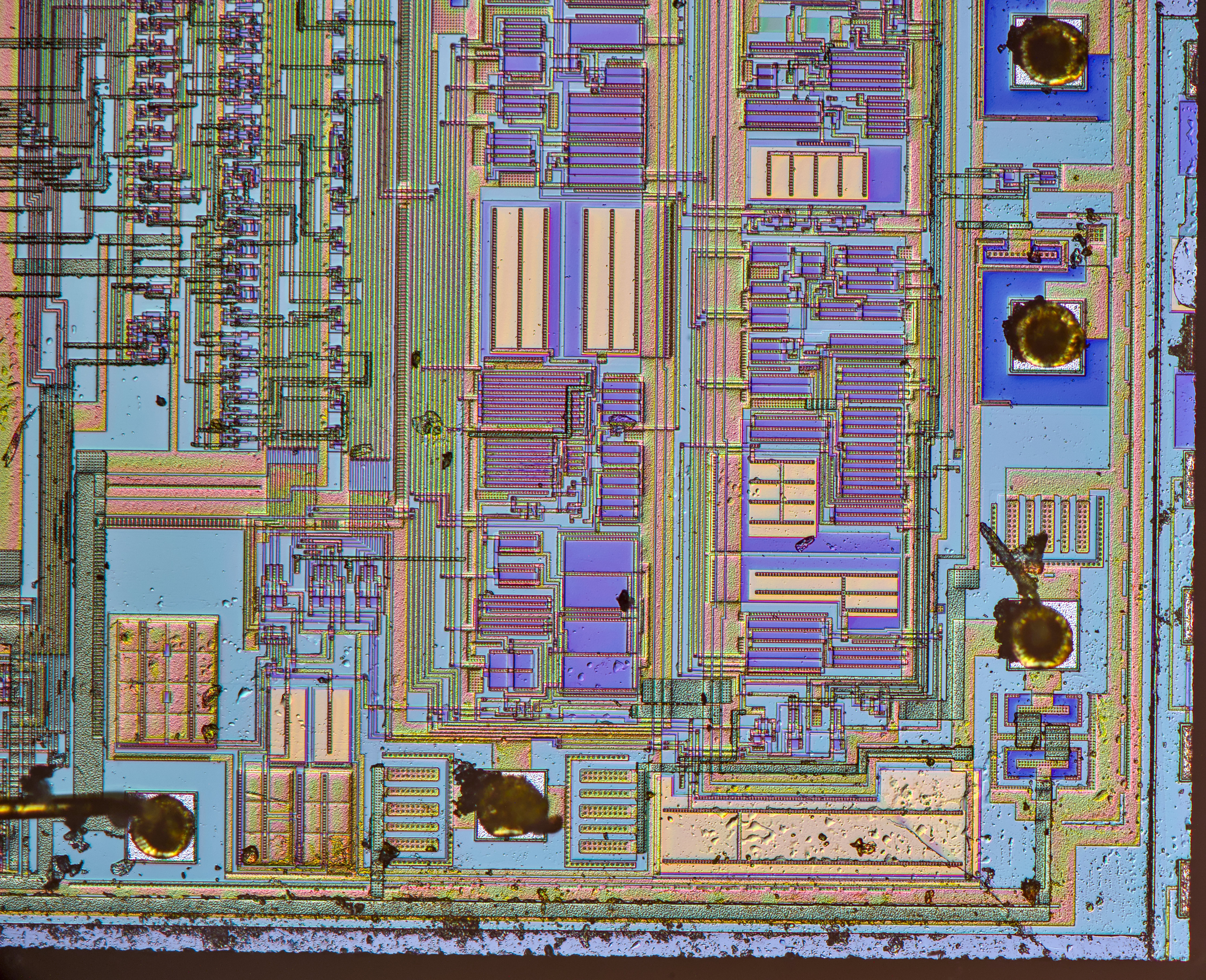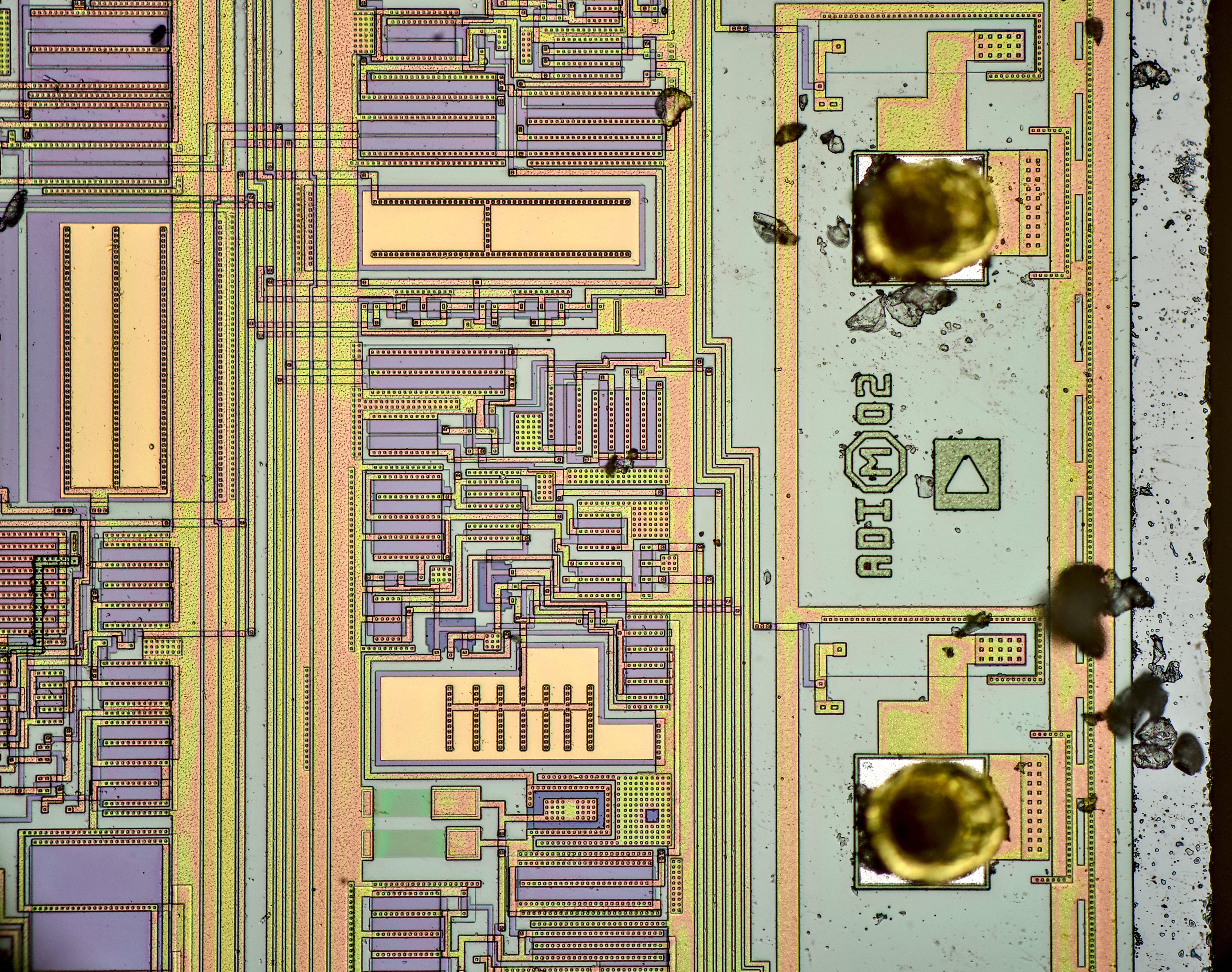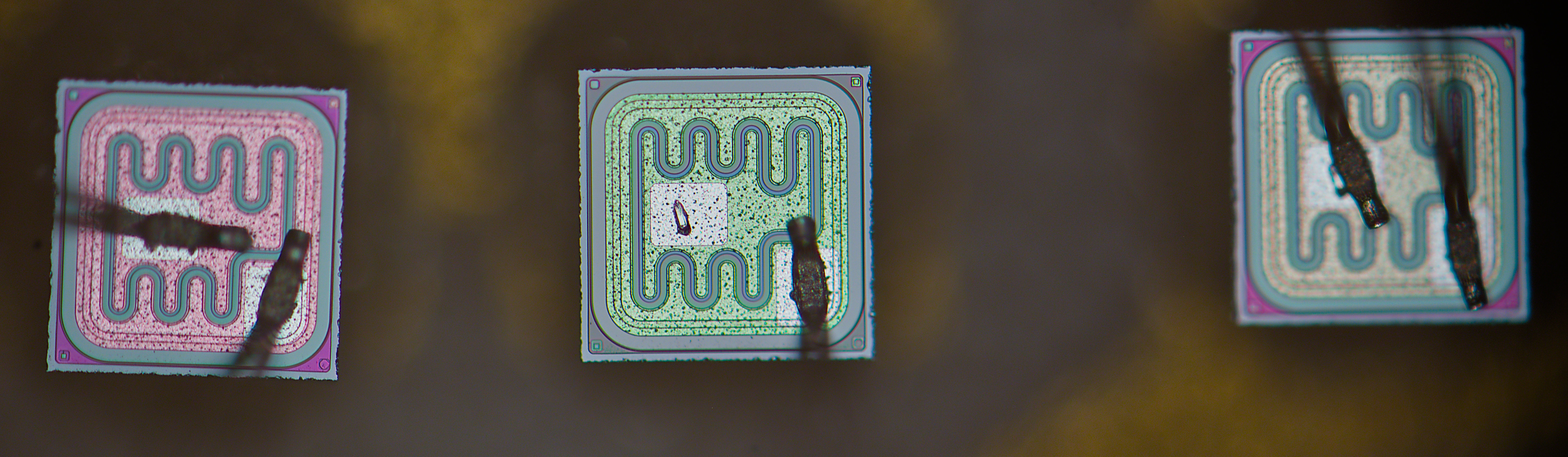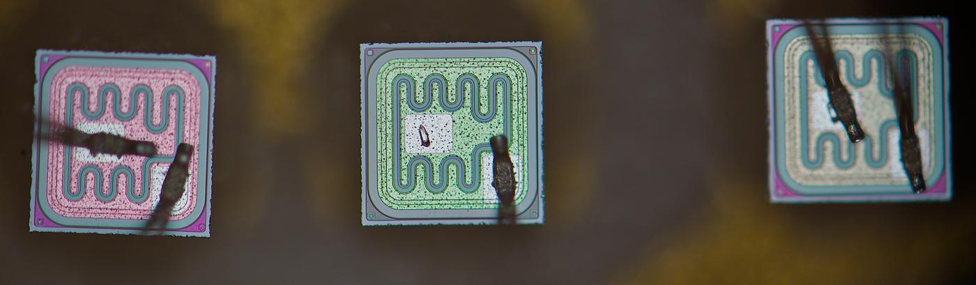 Focus-stacked image of larger transistor structure, with clearly visible squares around.