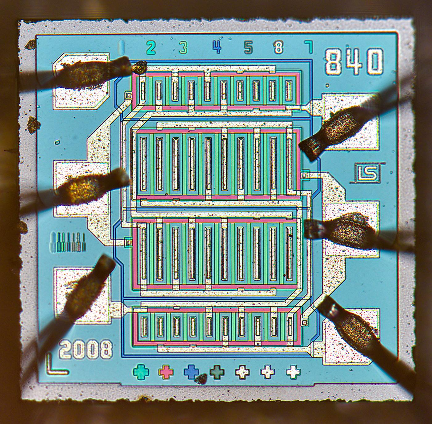 Input FETs are located on same die with seven process layers. Marking LS and 840 kinda suggests that it might be a Linear Systems LS840 dual JFET.