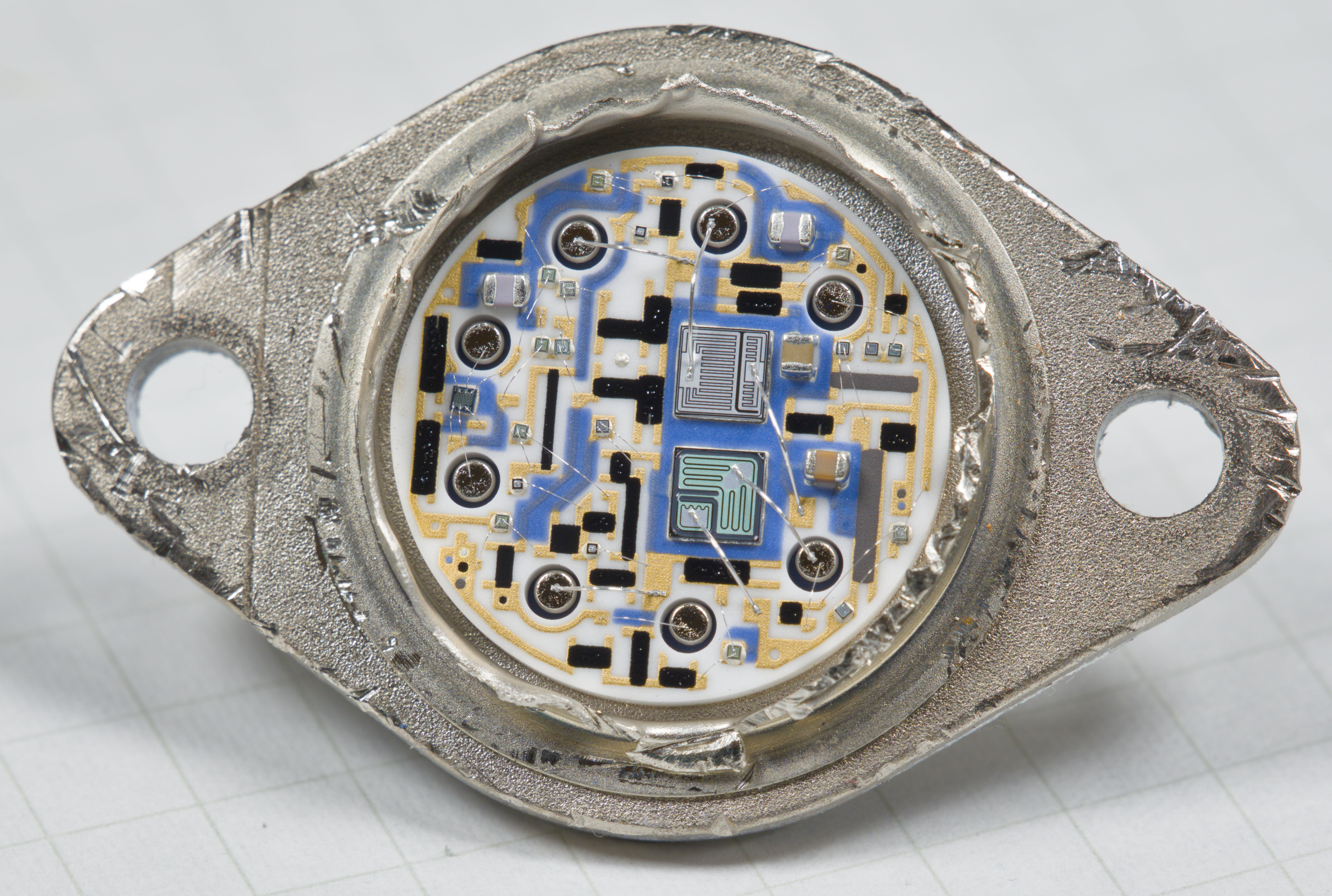 Opamp built with rather simple transistor and diode blocks with some passives embedded on BeO substrate and few 0606 sized capacitors.